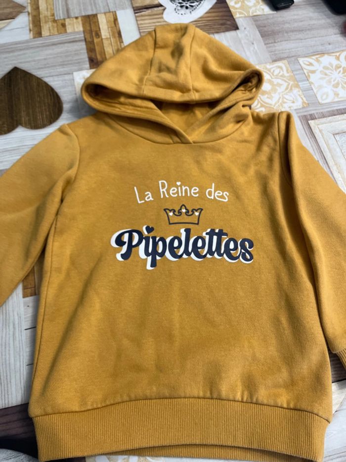 Pull sweat à capuche Motif « la reine des pipelettes » Couleur moutarde Taille 3 ans (94 cm) Marque Lili Marelle Réduction lot activée #magnounours_enfantfille3ans