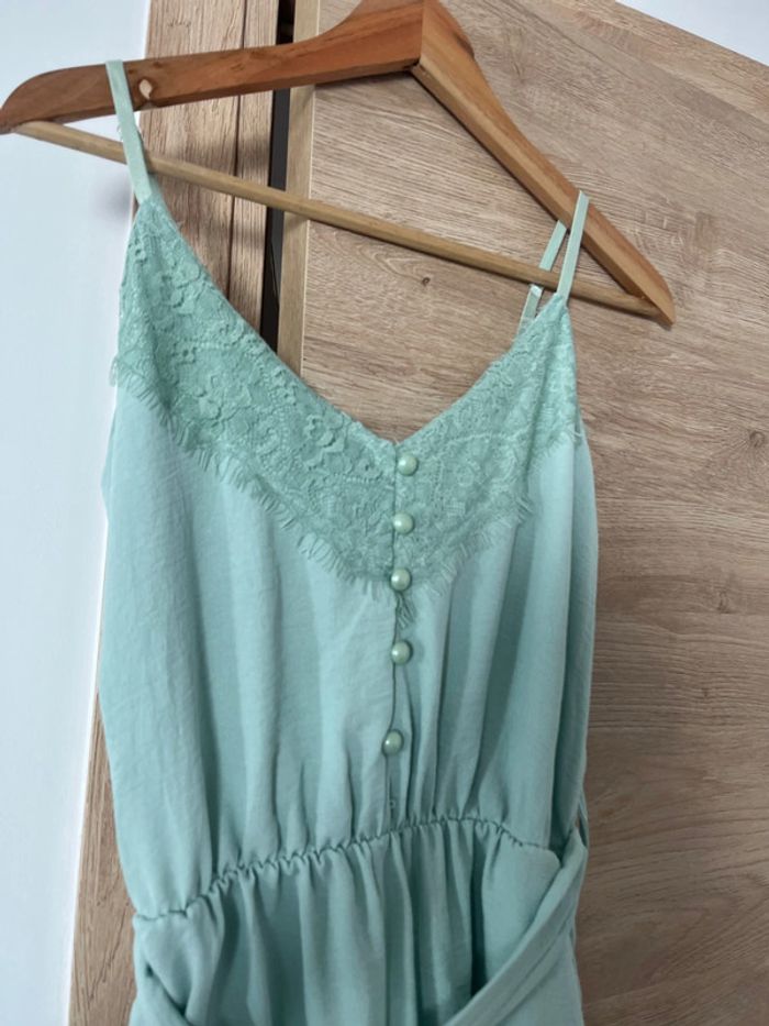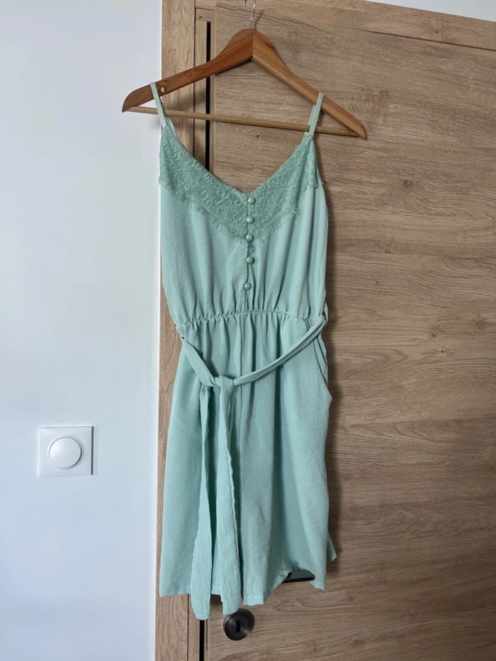 Combinaison short vert clair avec ceinture Élastique à la taille, dentelle sur le devant Jamais portée Taille Max 42 Marque New Collection Réduction lot activée #magnounours_femme