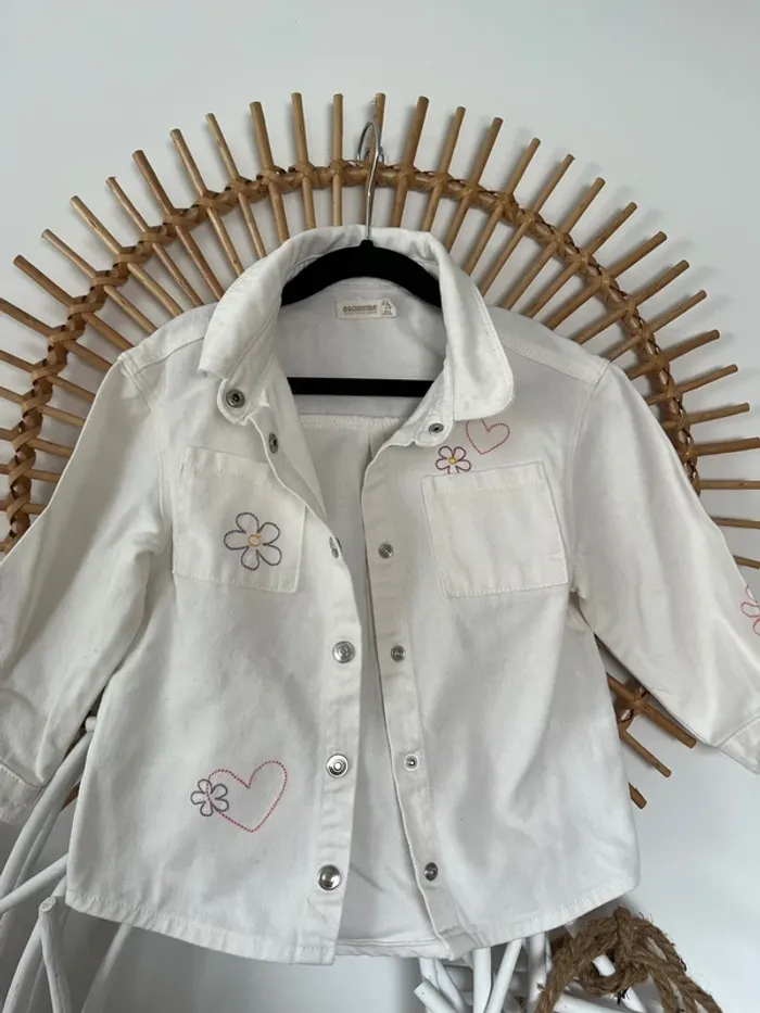 Chemise style jean couleur blanc motif cœur / fleurs Taille 4 ans (104 cm) Marque Orchestra Réduction lot activée #magnounours_enfantfille4ans