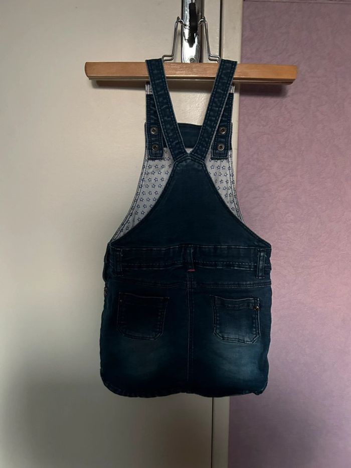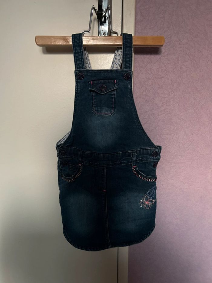 Robe en jeans bleu Taille 4 ans Marque orchestra 2 poches derrière 3 poches sur le devant + une petite 69% coton 30% polyester 1% elasthanne Motif une fleur sur le devant