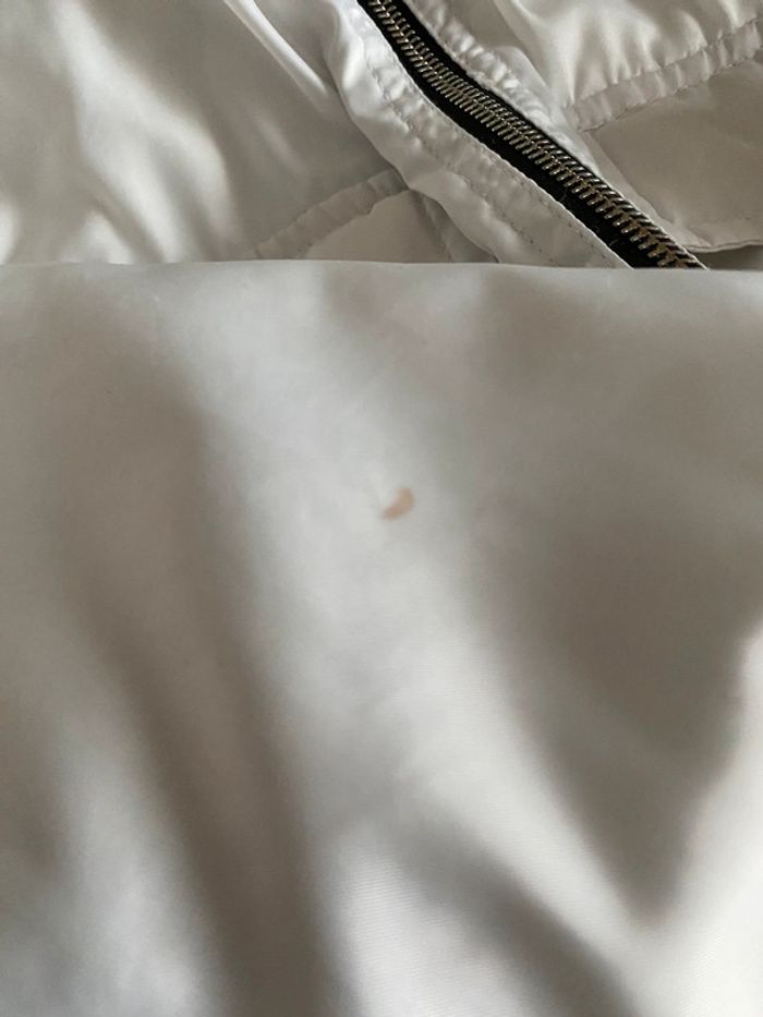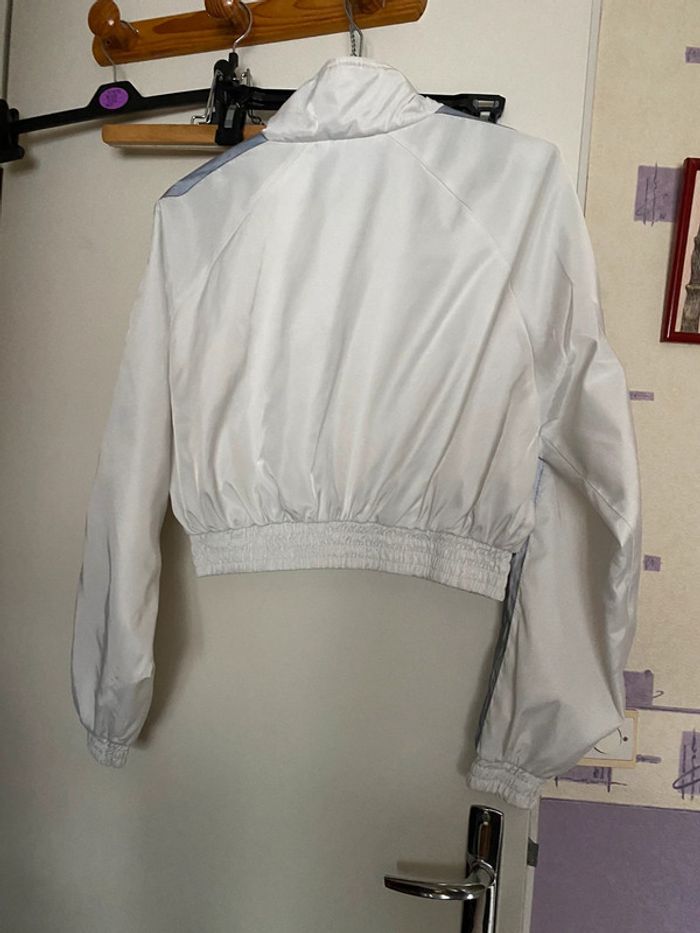 Veste courte Blanche et grise Taille S Bande réfléchissante sur les manches 2 poches sur le devant se ferme bouton pression Une minuscule petite tache sur un dessous de manche Voir sur la troisième photo