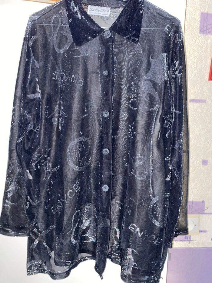 Chemisier vintage noir Neuf Motif dessins argentée Idéal pour une soirée Taille unique 95 % polyester 5% lycra