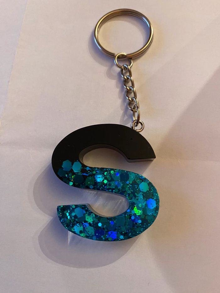 Porte clé neuf Lettre S Couleur bleu et noir Avec des paillettes Plastique dure