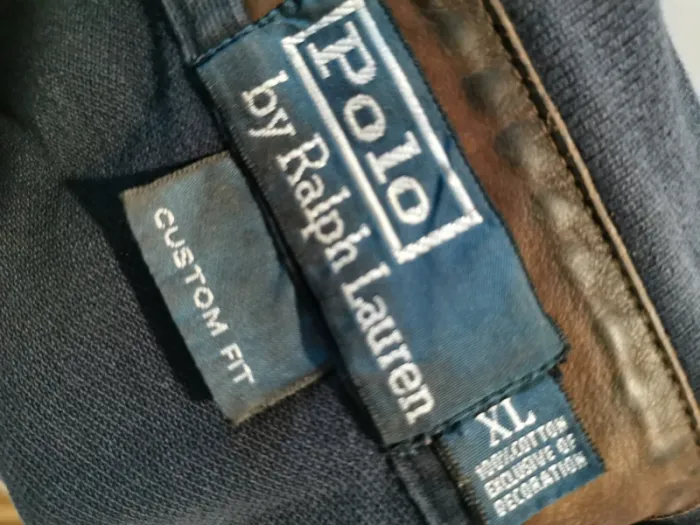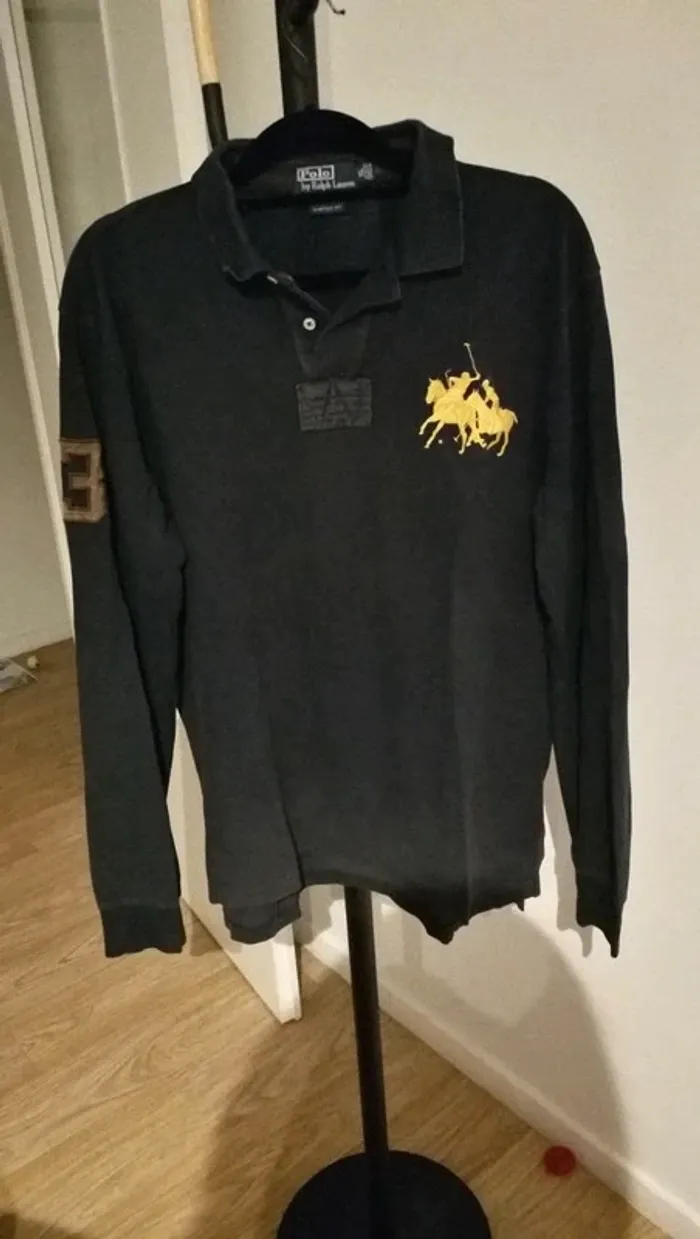Polo homme Ralph Lauren à manche longue. Double poney de couleur jaune et Présence d'un ecusson "3" sur la manche. De couleur bleu marine, en très bon état Article original (voir photos des étiquettes)