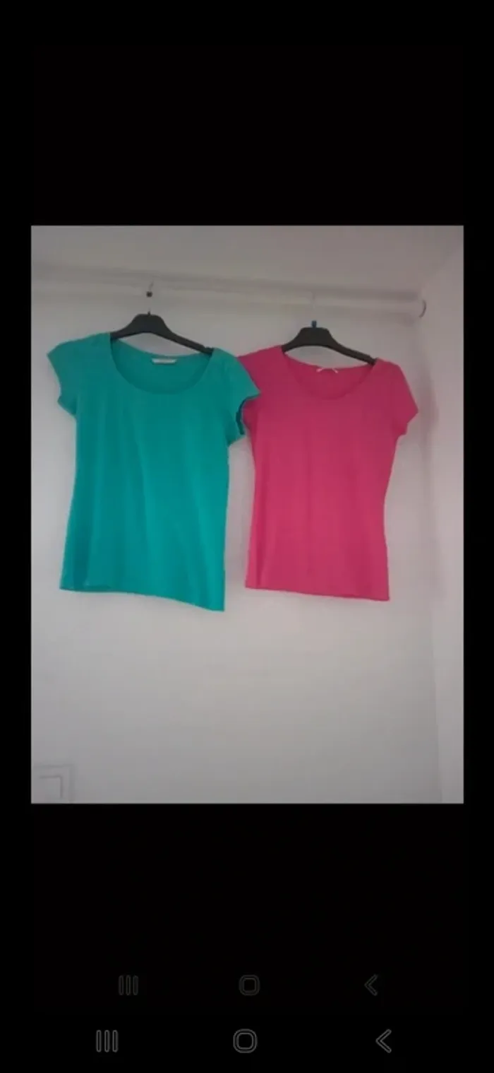 Lot de 2 t-shirts basiques, un turquoise et un rose, taille 38 (M). Coupe simple et confortable, très bon état. Idéal au quotidien. #fashionmode5908_T38 #tshirt #lot #turquoise #rose #taille38 #modefemme #basique #été