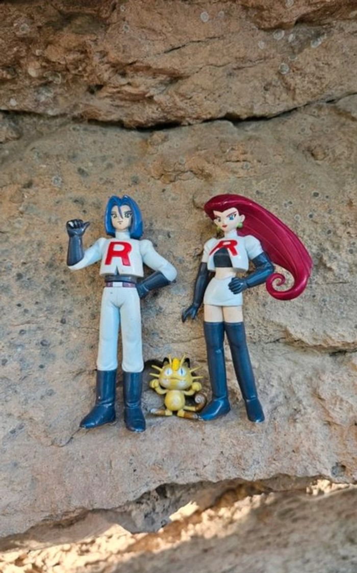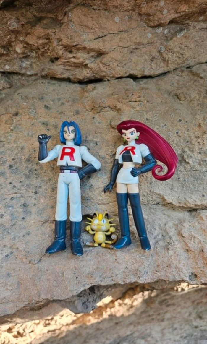 Super figurine Pokemon Nintendo tomy C.G.T.S.J team Rocket et son Miaous en bon état quelques trace d'usure vu l'ancienneté des figurines comme sur la photo.
