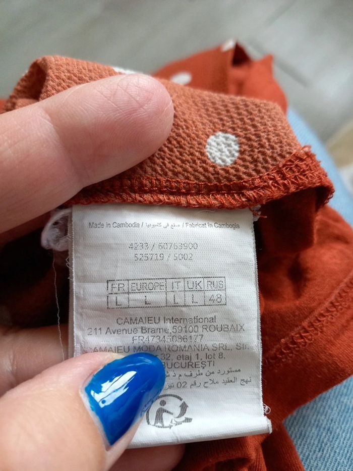 Col en V en dentelle,couleur cuivre ,90%polyamide et 10%nylon #blousecamaïeu40 #blouseàpoiscouleurcuivre #polyamideetnylon