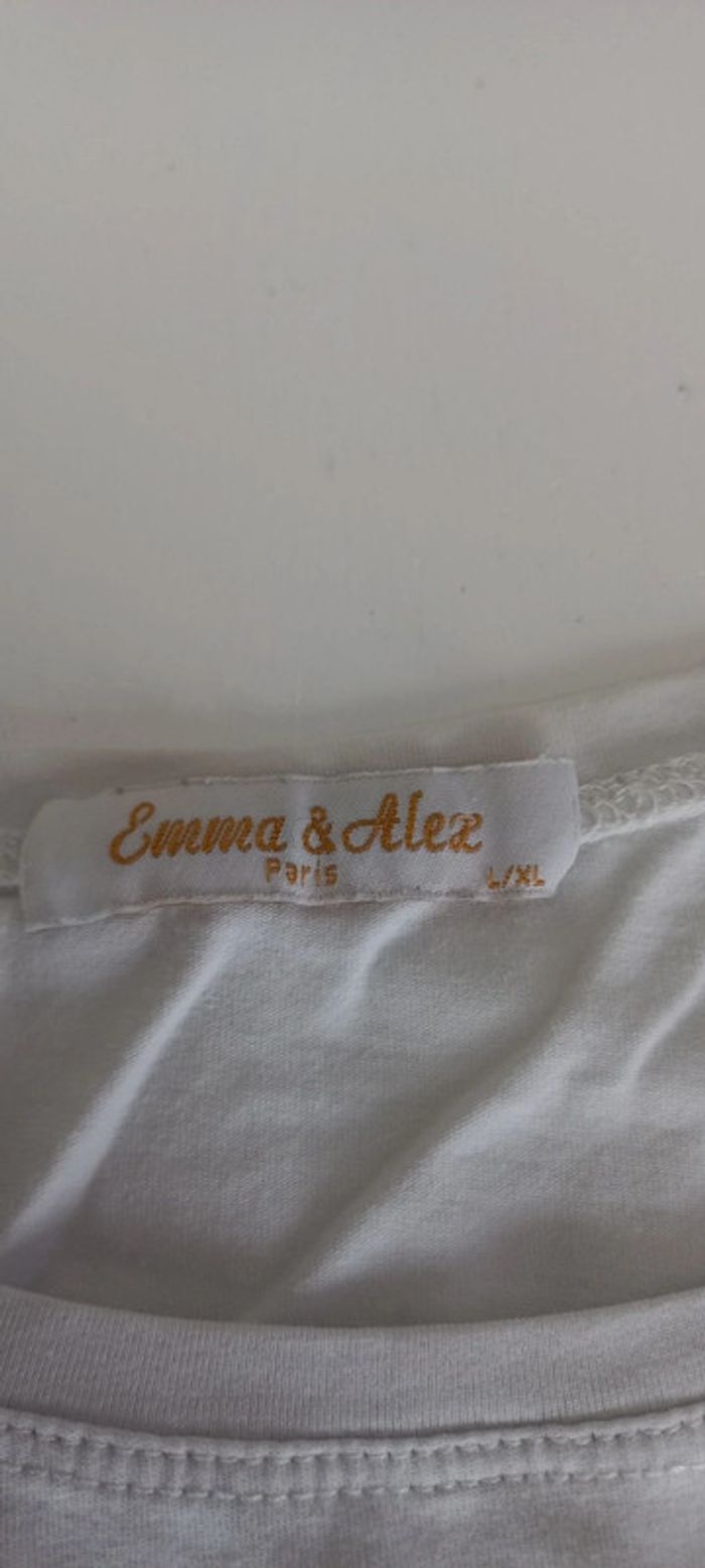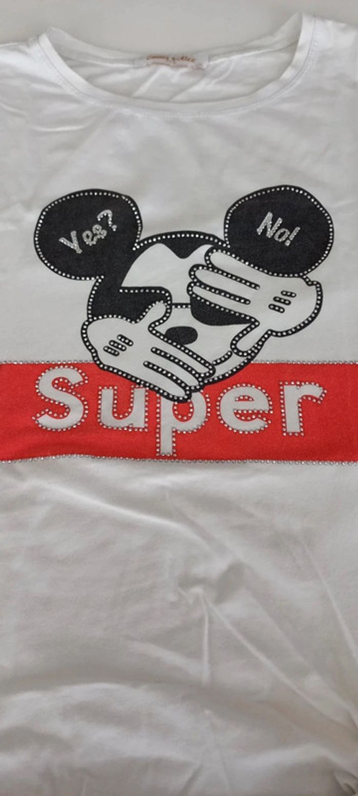 Souvent porté, motif mickey yes? No! ,noeud dans le bas du tee-shirt, une légère tache vers le noeud se vois très peu, taille L-XL #teeshirtmanchescourtes #teeshirtfemme #teeshirtblanc40 #emmaalex #motifmickey #vêtementfemmecorinne1389