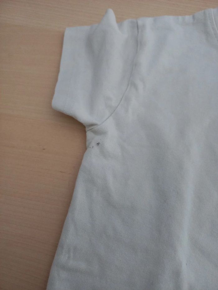 Porter quelques fois un manche courte style Marcel l'autre manche courte normal une légère tâche sous le bras du t-shirt blanc il n'y a que le Marcel qui est en petit bateau