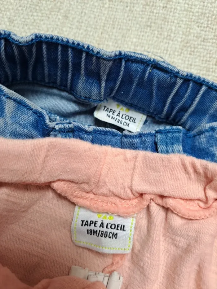 Lot de 2 shorts Tape à l'œil en taille 18 mois (ma fille est une crevette et les a portés plutôt vers 3 ans 😅). 🌼 Jean bleu avec effet délavé. Boutons pressions sur les côtés. Taille réglable. En excellent état. 🌼 Un rose corail en coton. Volants au niveau des cuisses. Taille réglable. Beaucoup porté mais toujours en bon état. Prix pour le lot . Autres articles en même taille 🖱 #tea80cm #tea18mois Autres articles TAO 🖱 #teatao #lot #short #tapealoeil #tao