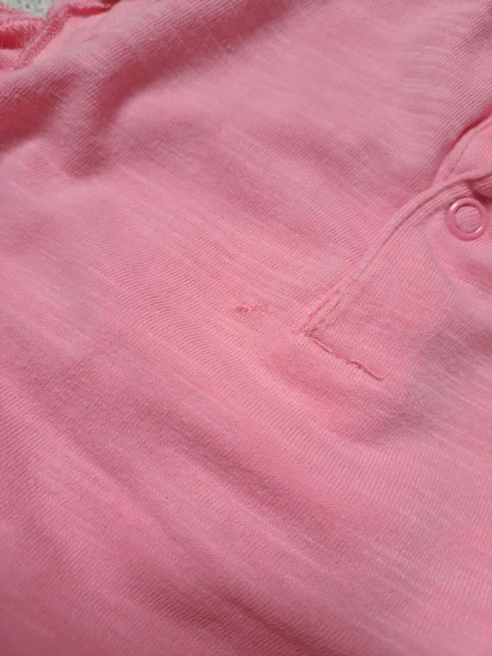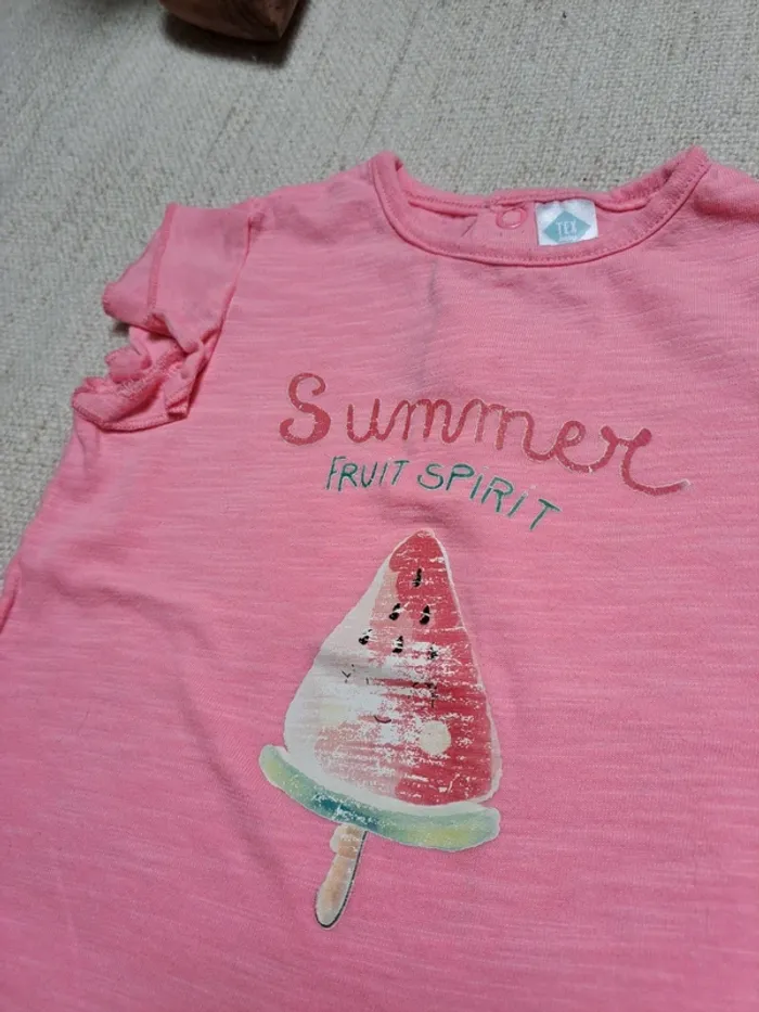 T-shirt manches courtes Tex en taille 23 mois. Il est rose fluo avec une pastèque et l'inscription Summer fruit spirit. Volants sur les épaules. Boutons pressions dans le dos. En très bon état excepté un petit défaut dans le tissu peu visible à l'arrière (voir dernière photo). Autres articles en même taille 🖱 #tea24mois #tea86 #tshirtmanchescourtes #pastèque #tex #été #summer