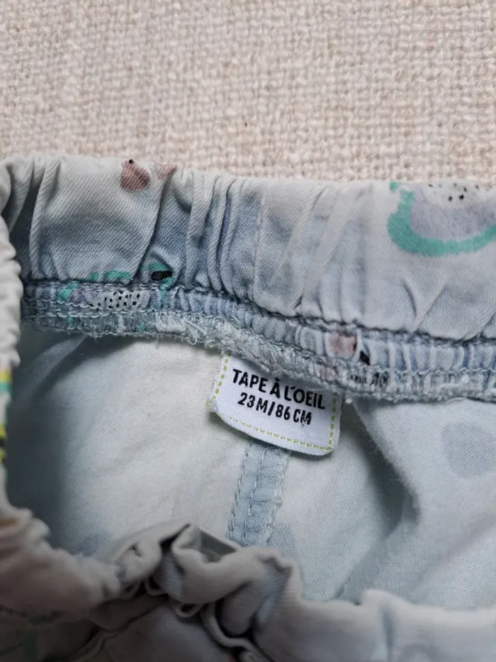 Short Tape à l'œil en taille 23 mois. Jean bleu clair avec des motifs fruits (cerise, citron, poire,...). Élastique à la taille. Possibilité de resserrer. Il est en très bon état mais il y a quelques décolorations (voir photos - je ne sais plus si c'est d'origine d'où le petit prix). Autres articles en même taille 🖱 #tea86cm #tea24mois Autres articles TAO 🖱 #teatao #short #tao #tapealoeil #ete #fruit #cerise #citron #poire