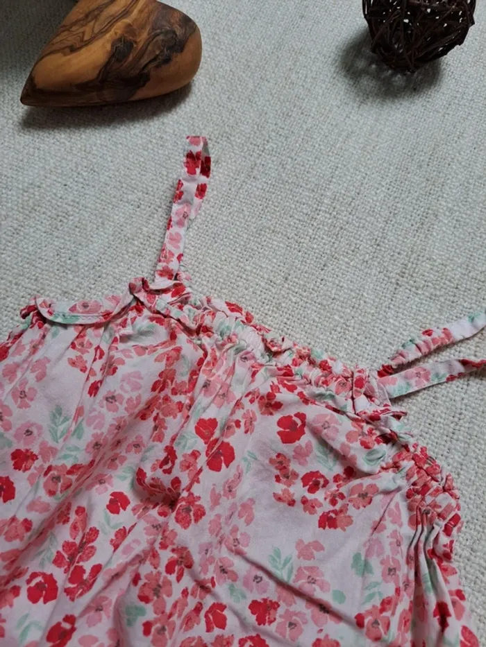 Barboteuse H&M en taille 9-12 mois. Joli motif fleuri dans les tons rose, rouge et vert d'eau. Volant au niveau des cuisses. Petits nœuds sur le haut. Boutons pressions à l'entrejambe. Peu portée, en excellent état. Autres articles en même taille 🖱 #tea80cm #tea12mois Autres articles H&M 🖱 #teahm #barboteuse #été #hm #combi #fleur