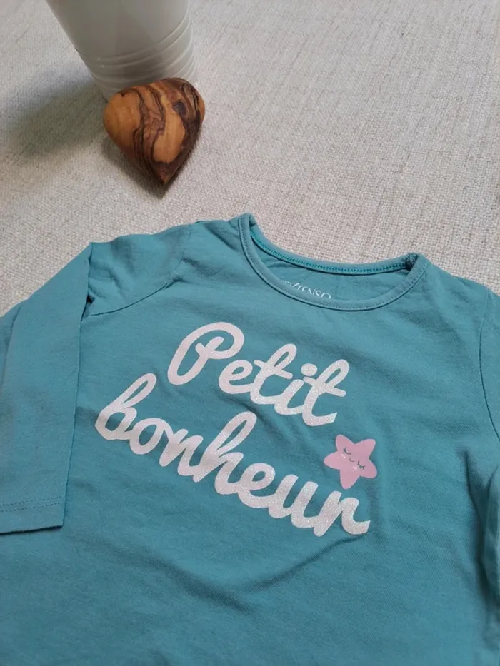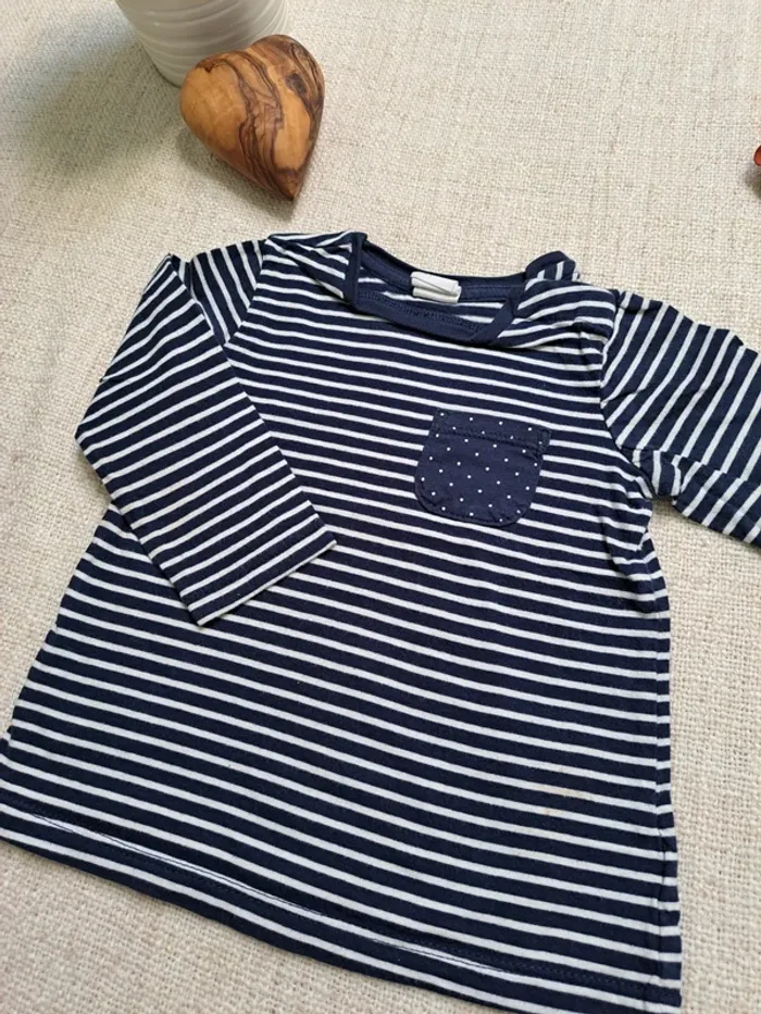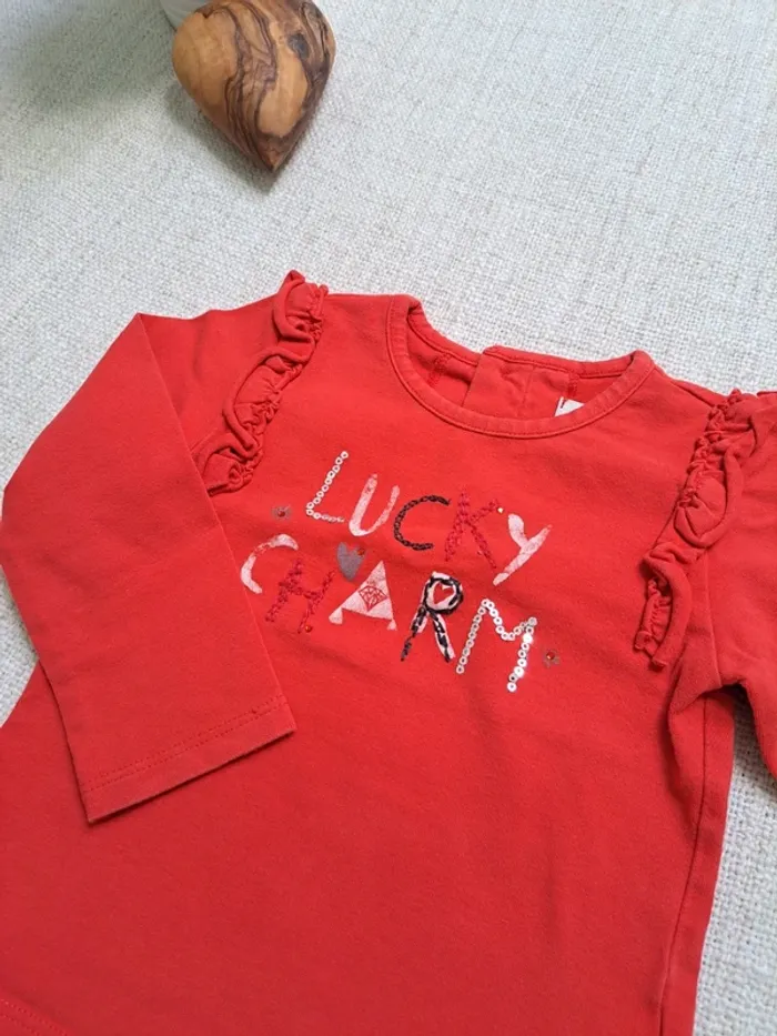 Lot de 3 t-shirts manches longues en taille 80. ❤️ Jean Bourget : rouge avec l'inscription Lucky charm. Détails sequins. Volants sur les épaules. Boutons dans le dos. ❤️ H&M : rayé blanc et bleu marine. Poche sur le haut avec des petits pois blancs. ❤️ In Extenso : turquoise avec l'inscription Petit bonheur en paillettes. Ils sont en très bon état. Autres articles en même taille 🖱 #tea80cm #tea18mois #lot #tshirtmancheslongues #hm #inextenso #jeanbourget