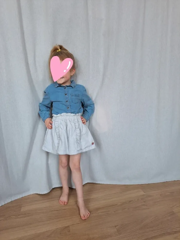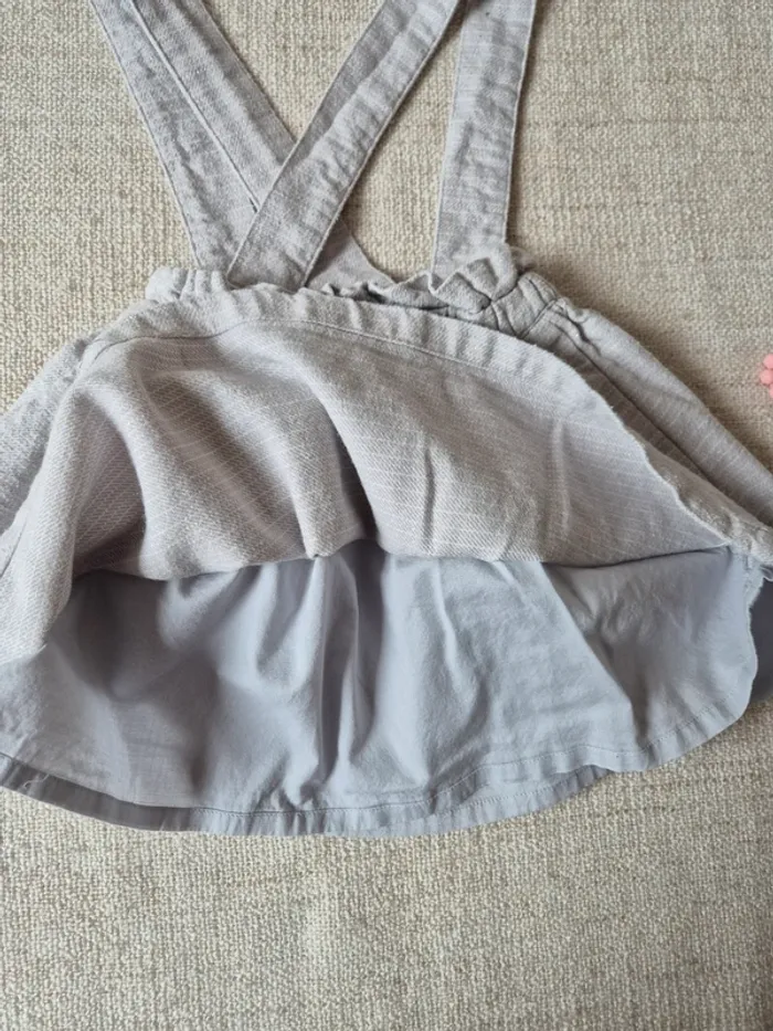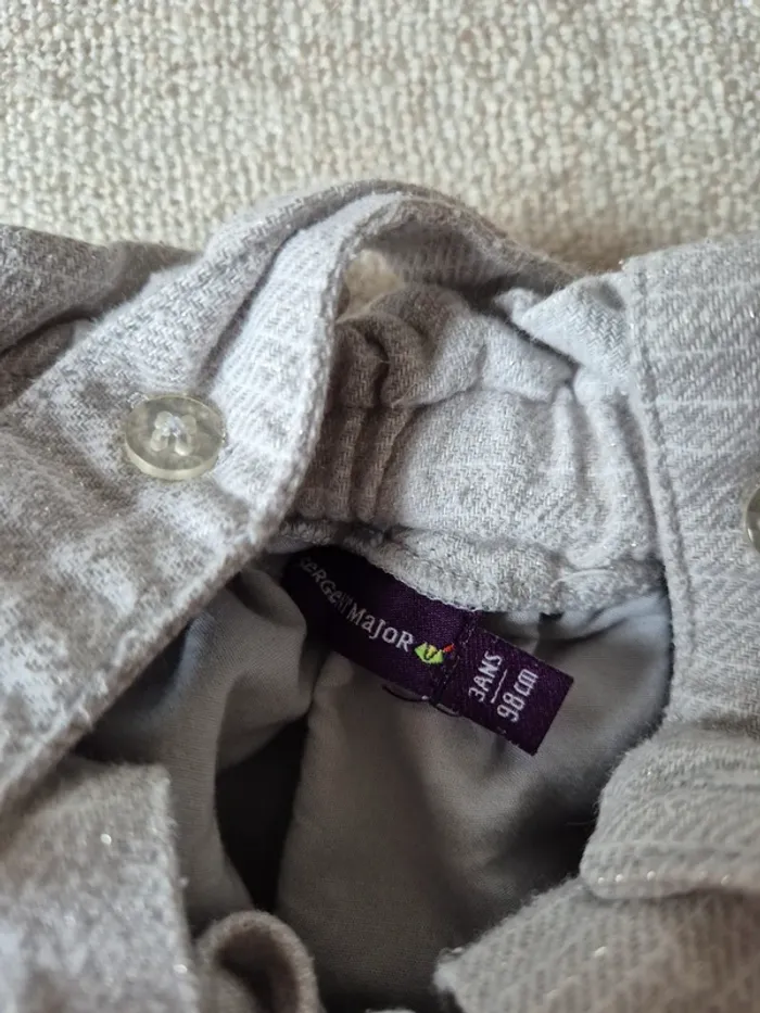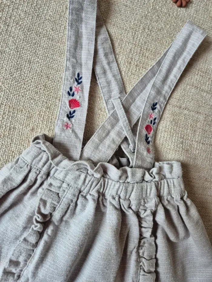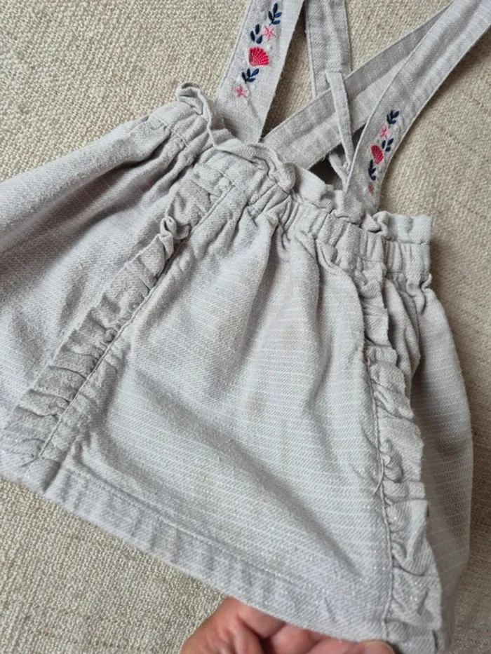 Jupe à bretelles Sergent Major en taille 3 ans. Elle est grise avec des fils argentés. Volants sur l'avant. Jolies broderies sur les bretelles. Elle est doublée. Petit prix car beaucoup portée et légèrement tachée (voir photos). Autres articles en même taille 🖱 #tea98cm #tea3ans #jupe #jupeabretelles #sergentmajor