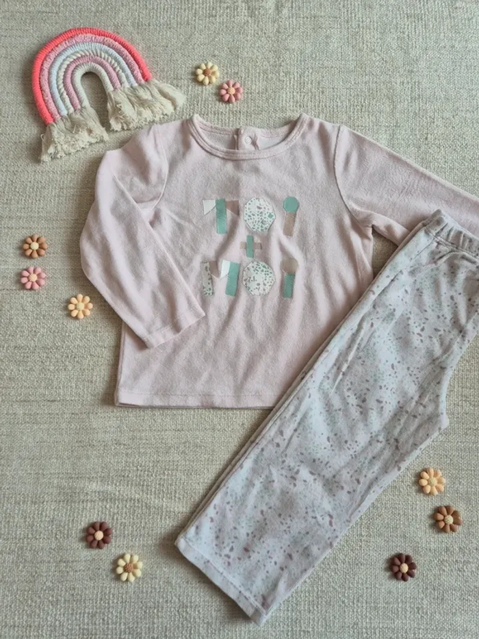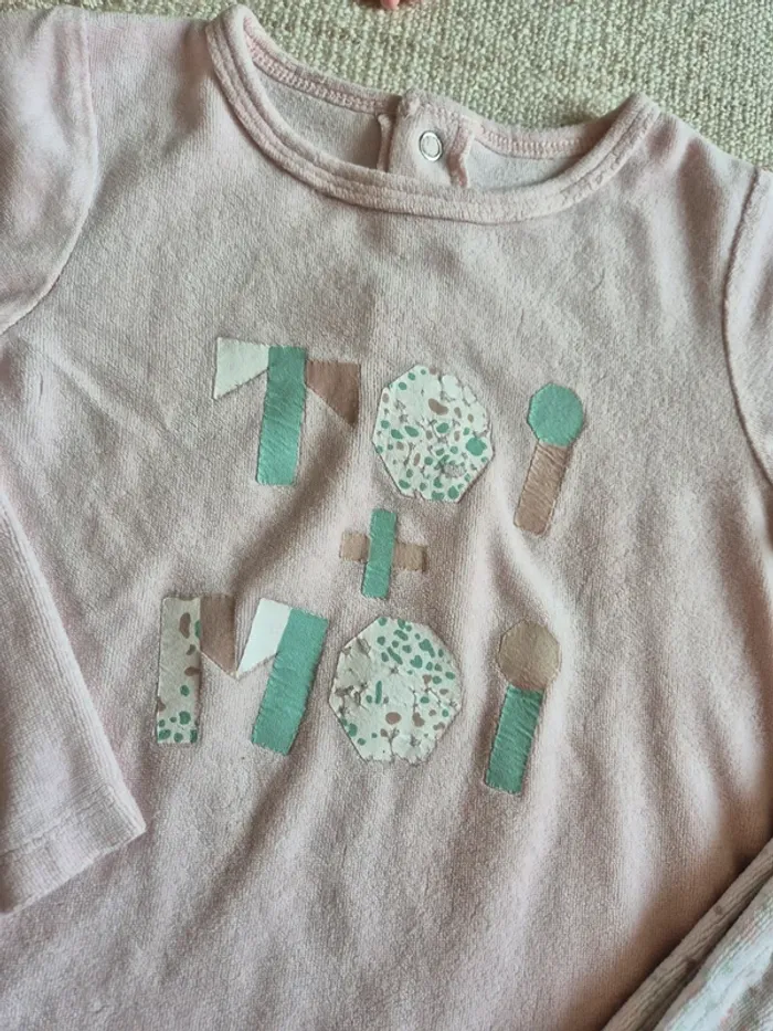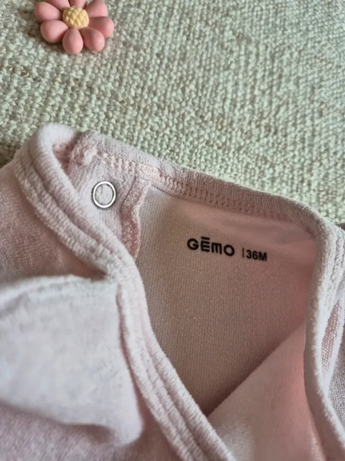 Pyjama chaud Gemo en taille 36 mois. Haut rose pâle avec l'inscription Toi + moi. Boutons pressions dans le dos. Bas blanc avec des motifs dans les tons roses et vert d'eau. En très bon état excepté l'inscription qui est légèrement craquelée. Autres articles en même taille 🖱 #tea92cm #tea36mois #pyjamachaud #pyjama2pieces