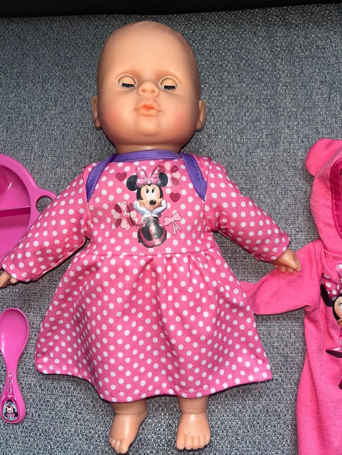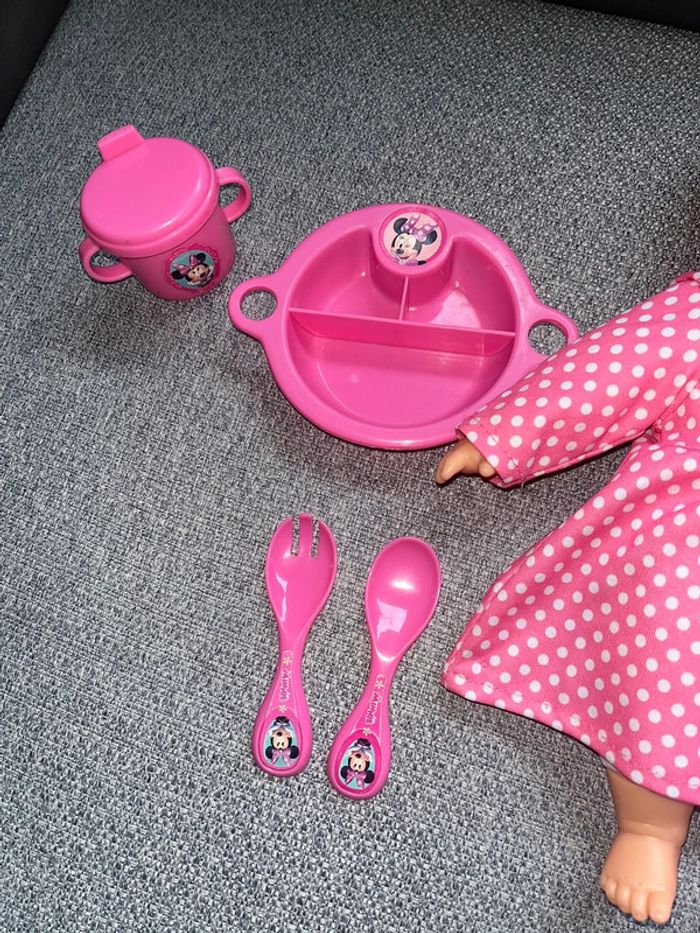Poupon Simba Minnie et accessoires Deux tenues, une assiette, un verre tasse et couverts La combinaison est un peu boulocher