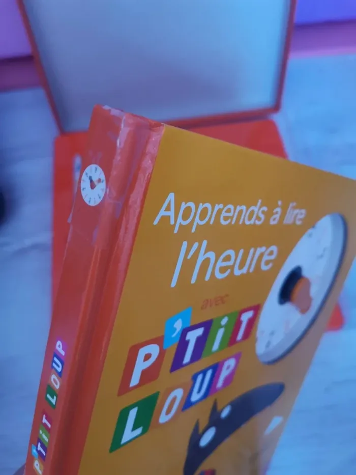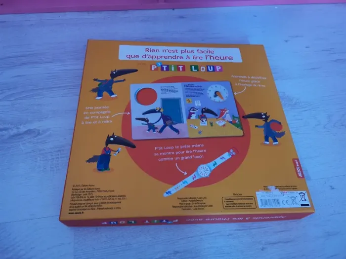 Coffret apprends à lire l'heure avec p'tit Loup Le coffret est en très bon état. A noté que le coin du livre commençait à s'abîmer j'ai mis du scotch Vendu avec une pile neuf