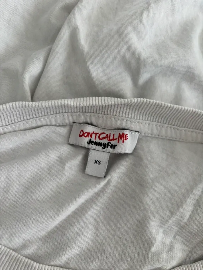 T shirt court blanc Don't call me Jennyfer (étiquette intérieure coupée) XS Très bon état Pour voir mes autres articles pour femme et ados : #femmeludi2607 N'hésitez pas à faire des lots ✨ Réduction dès 2 articles ✉️Pas de remise en main propre