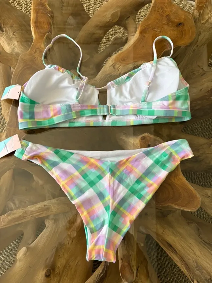 Maillot de bain 2 pièces Ardene Swim À carreaux pastel Haut : avec coussinets amovibles / plusieurs positions de réglage dans le dos / Bretelles réglables Bas : échancré Taille L Neuf avec étiquette N'hésitez pas à faire des lots ✨ réduction dès 2 articles (d'autres maillots de bain à vendre) Pour voir mes autres maillots de bain à vendre : #mdbludi2607 ✉️Pas de remise en main propre