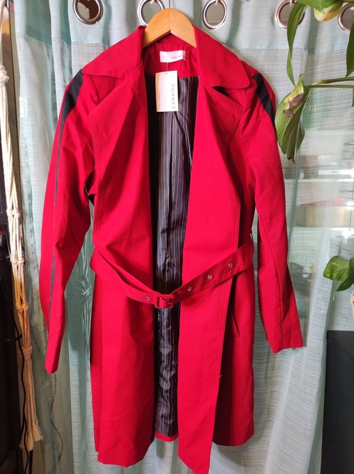 Trench rouge et bande sur le côté. Interieur satiné, sans fermeture et poche fermer (cf photo) avec ceinture , poches latérales. Marque camaïeu en taille S Jamais porter, en parfait état. Encore étiqueté.