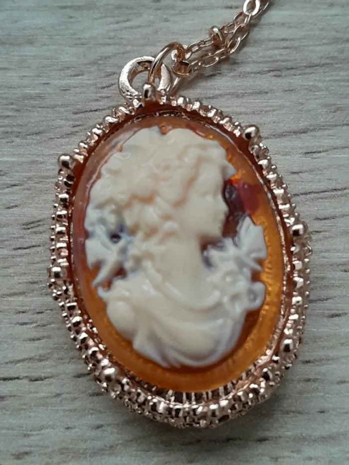 Collier avec pendentif camée, doré et le fond du médaillon couleur rouille la chaine mesure: 40cm+7cm le pendentif mesure : hauteur 3,5cmX2,3cm de largeur Alliage de zinc, plaqué or Neuf - Idéal cadeau