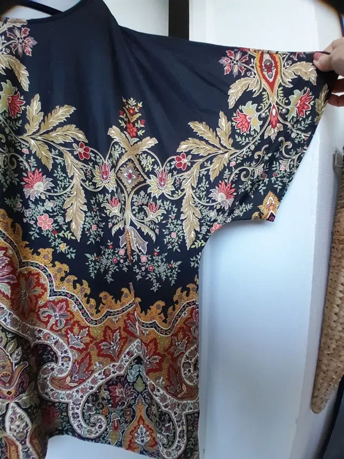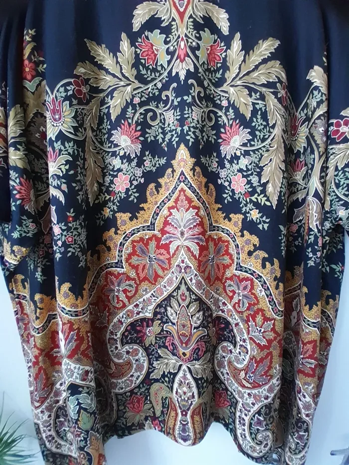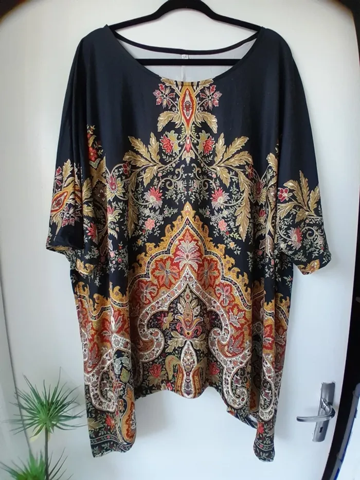 T-shirt imprimé (rosaces, style bohème), taille 5XL, fond noir Manches raglan courtes 96% polyester + 4% elasthanne MESURES DU VETEMENT Hauteur totale : 60cm et 90cm de chaque côté hauteur à partir de sous bras : 50cm tour de poitrine : 134cm