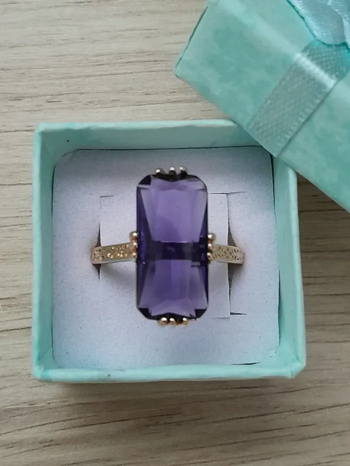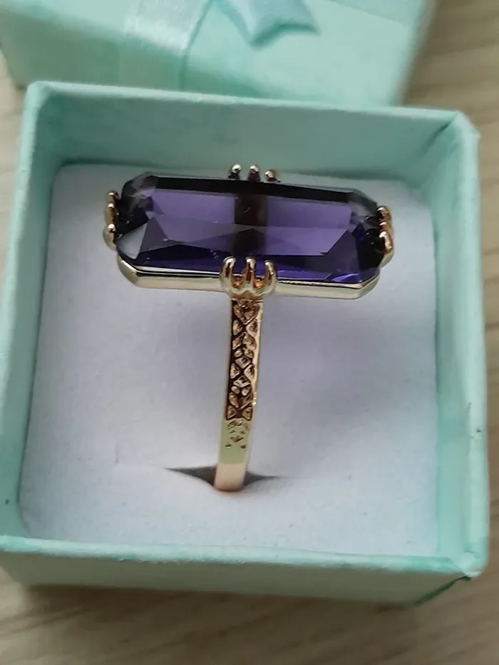 Bague rectangulaire, longue pierre couleur violette ciselée taille 60 Alliage de zinc, doré