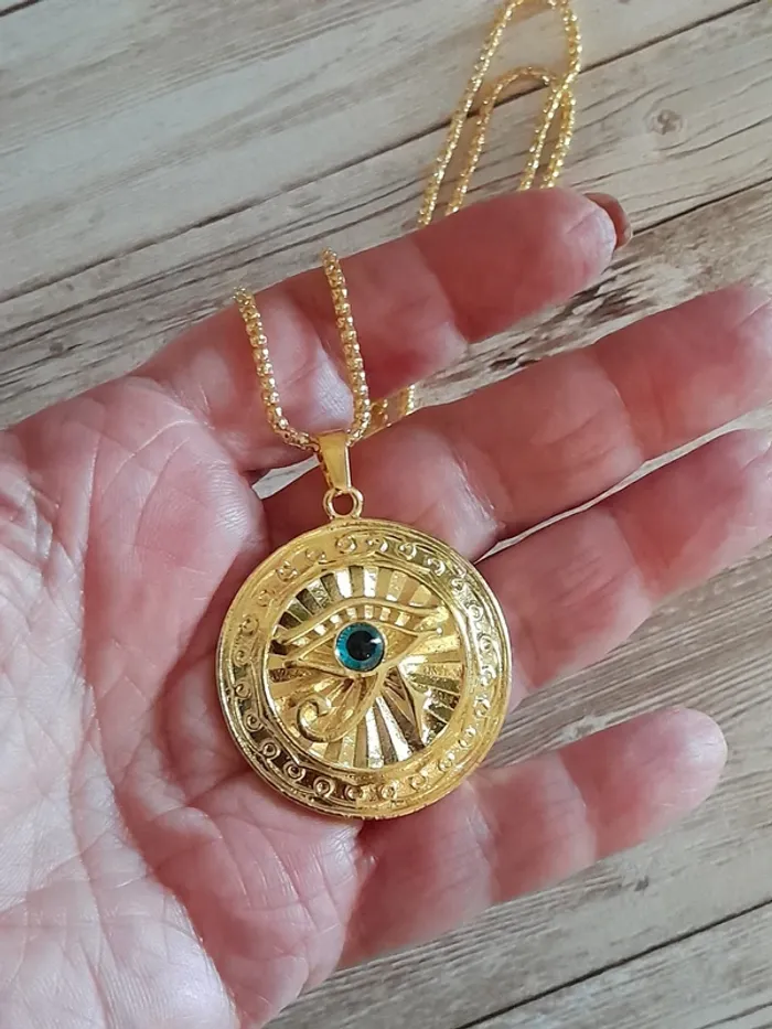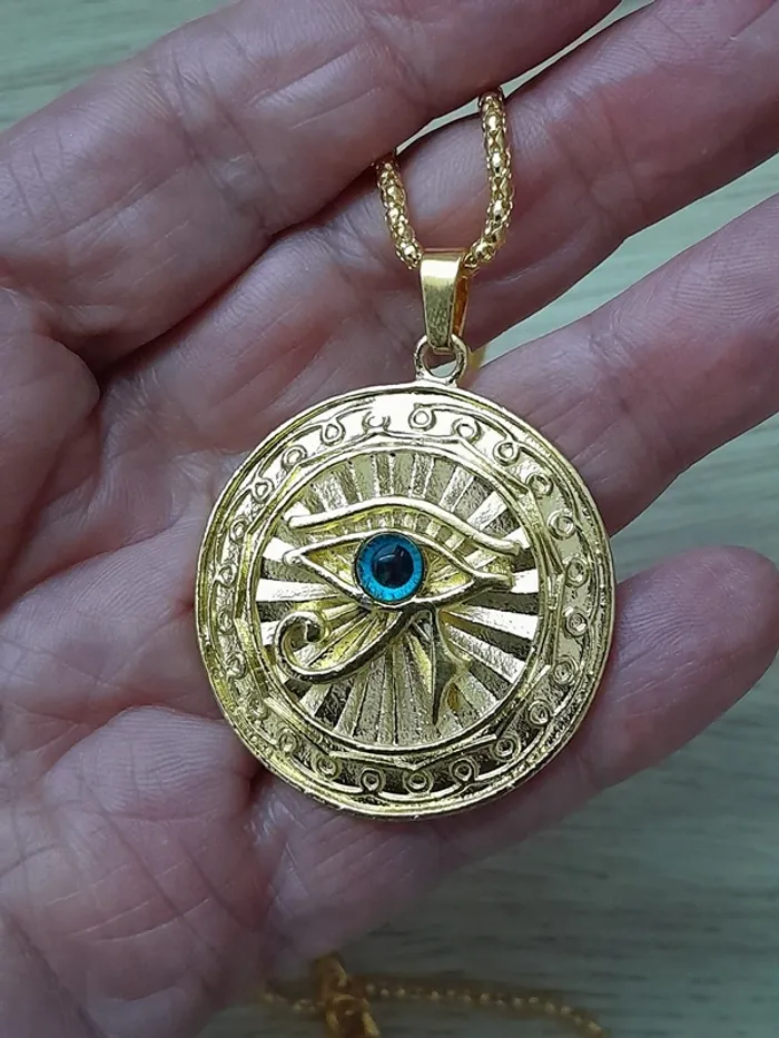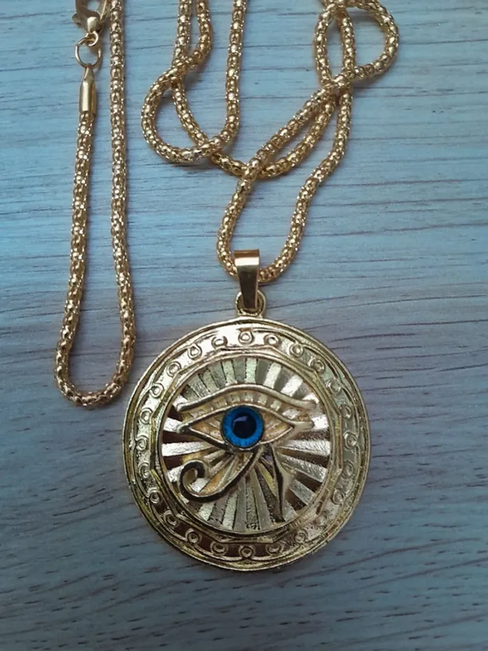Collier pendentif Egyptien, oeil d'Horus, oeil de protection, couleur doré le pendentif mesure : 3,7cm de diamètre la chaine mesure: 60cm Alliage de zinc, doré