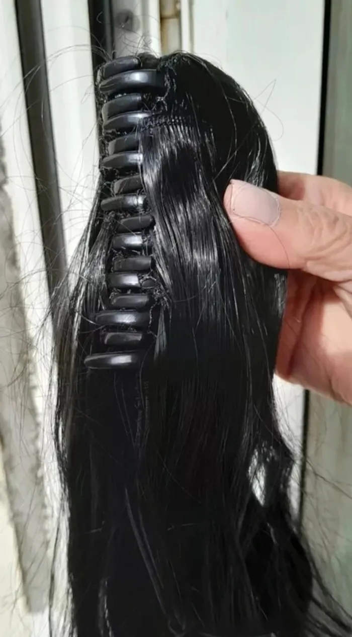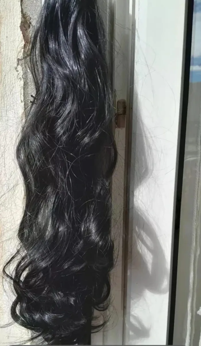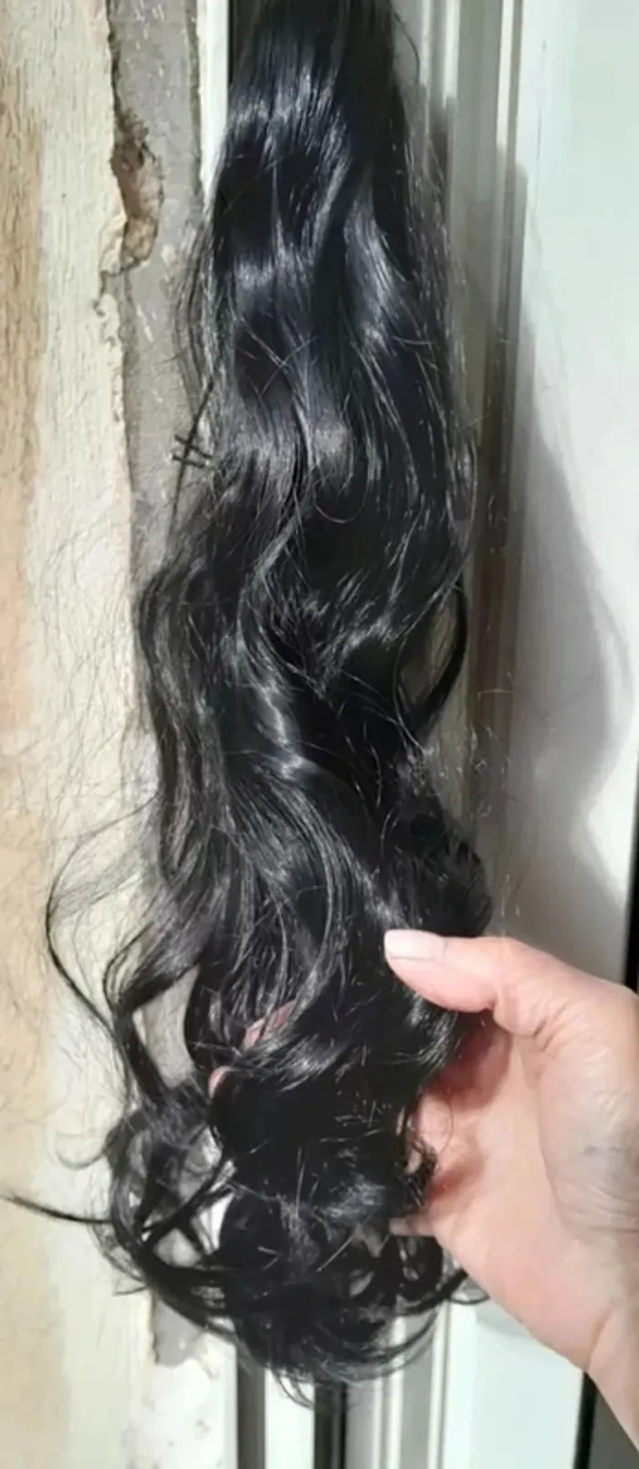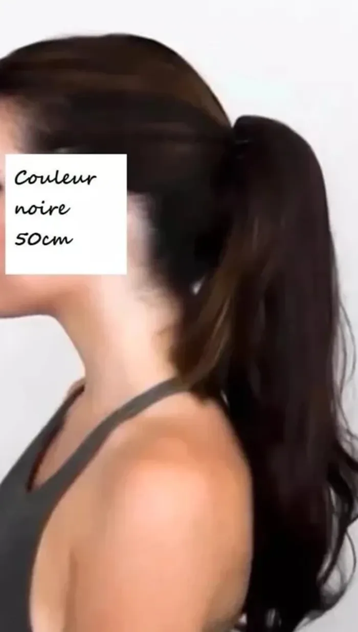Sublime Queue de cheval à pince, Bouclée mi cheveux synthétiques et mi cheveux naturels couleur NOIRE - 50cm La queue de cheval se lave avec un shamooing normal. Ne pas sécher avec un sèche cheveux - laisser sécher naturellement