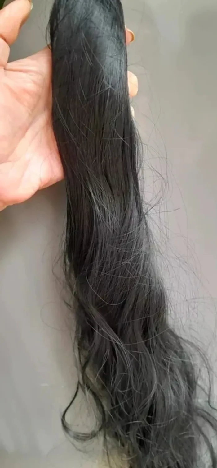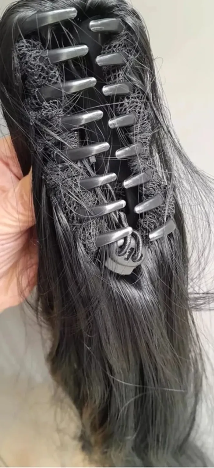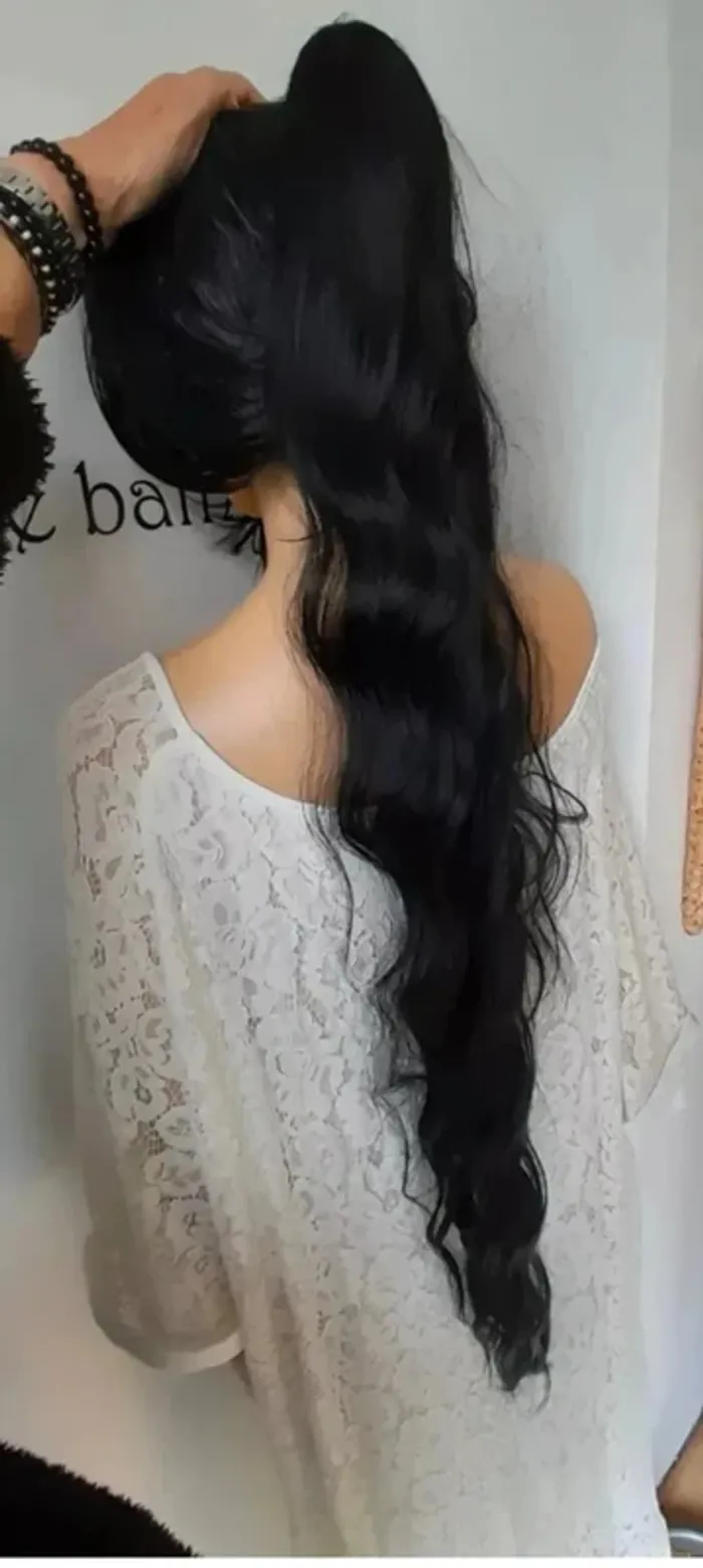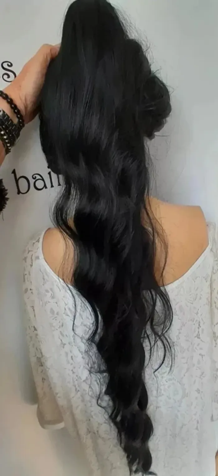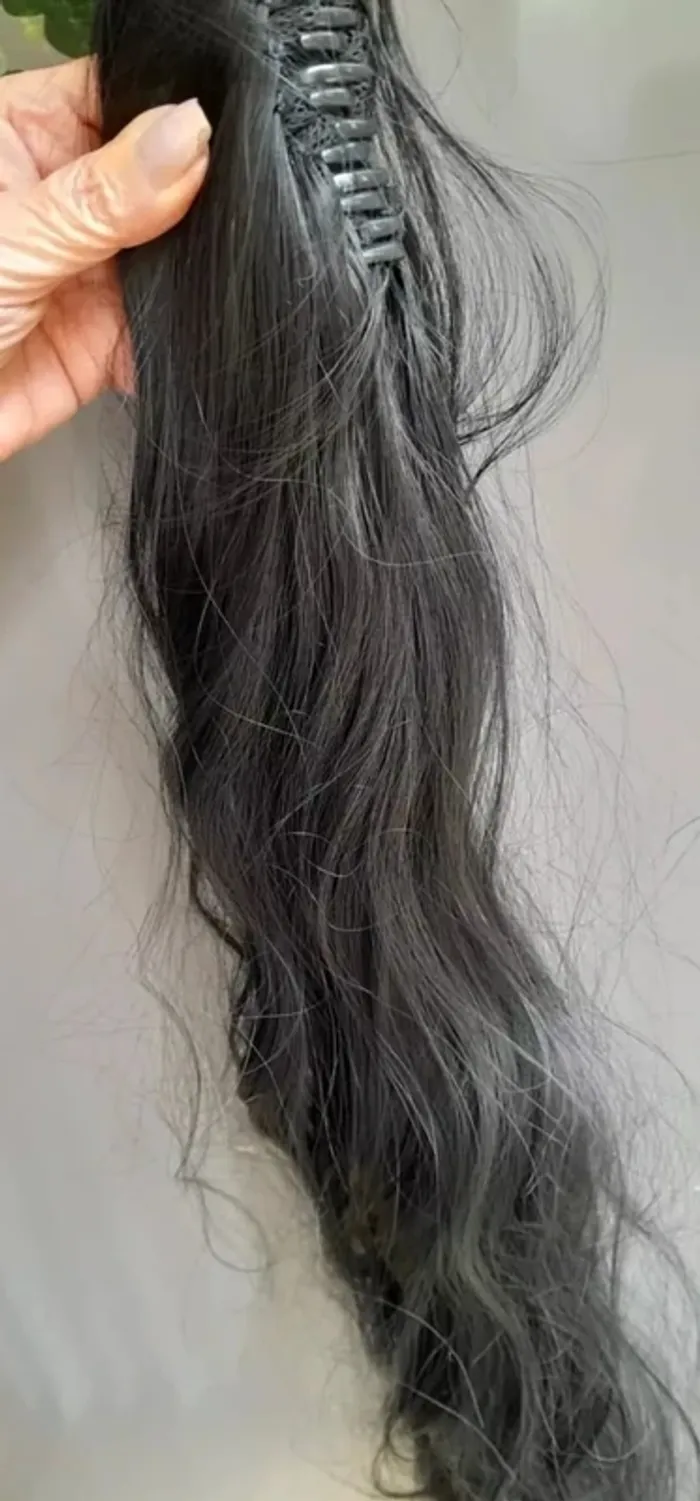 Queue de cheval à pince, mi cheveux synthétiques et mi cheveux naturels couleur noir - 80cm La queue de cheval se lave avec un shamooing normal. Ne pas sécher avec un sèche cheveux - laisser sécher naturellement