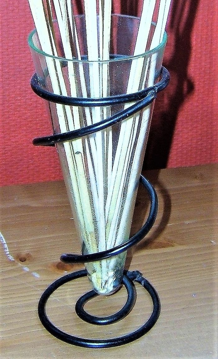 Por à pot pourri ou à bâtons d'encens en vere transparent sur socle en métal noir, tbé.
