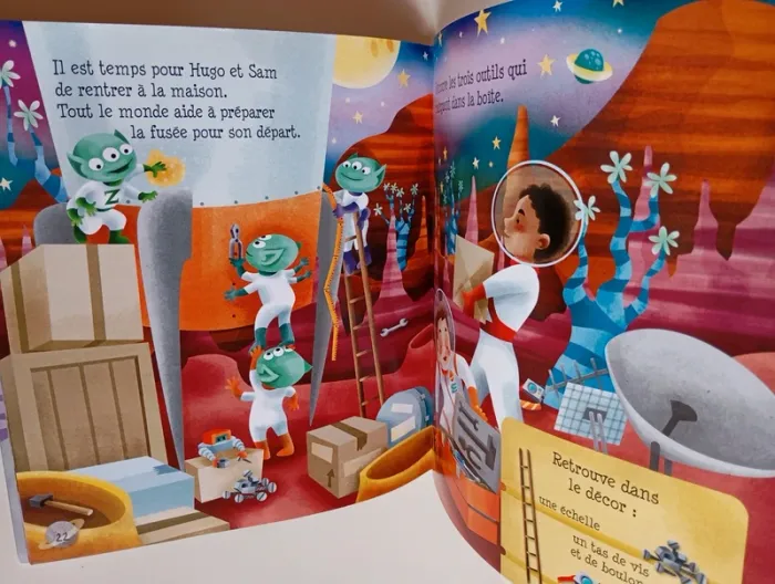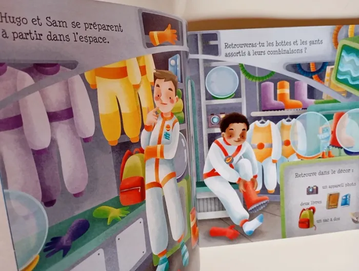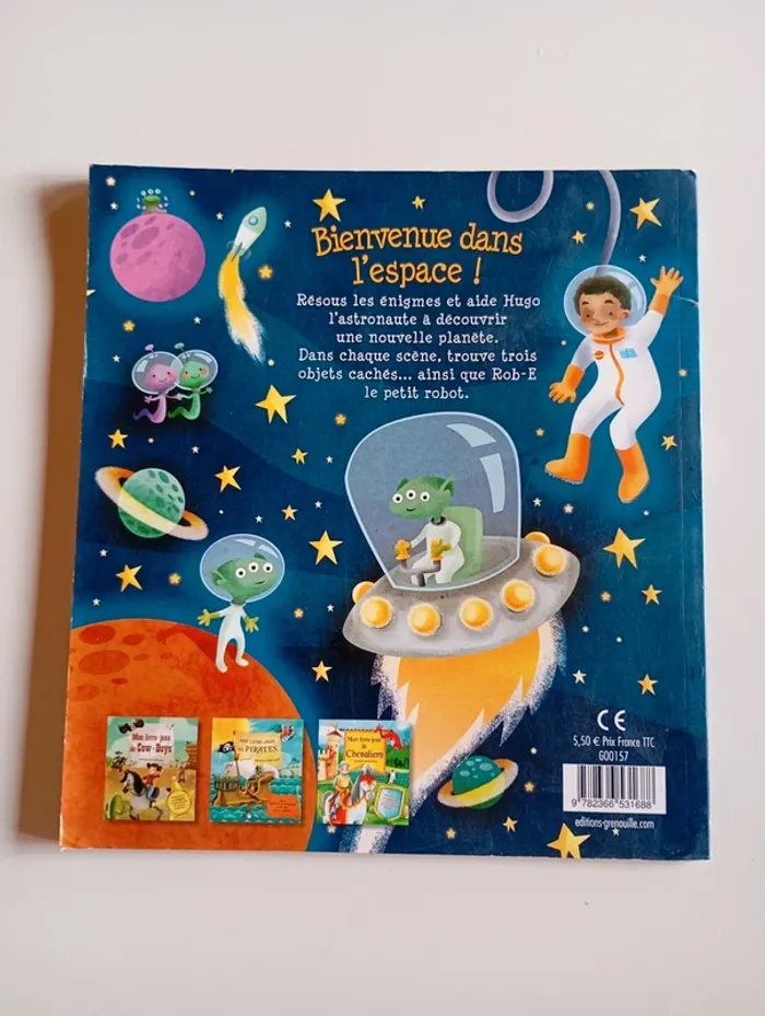 Résous les énigmes et aide Hugo l'astronaute à découvrir une nouvelle planète. Dans chaque scène, trouve trois objets cachés... ainsi que Rob-E le petit robot. Éditeur ‏ : ‎ Grenouille Editions 32 pages Âge de lecture ‏ : ‎ 0 - 5 ans Dimensions ‏ : ‎ 23.1 x 0.4 x 25.3 cm Livre en très bon état Je vends d'autres livres sur l'espace #phil_peg_espace #espace #astronaute
