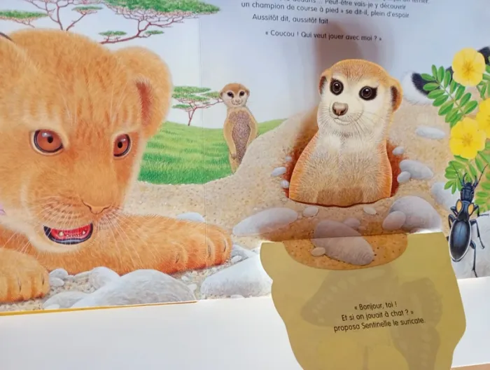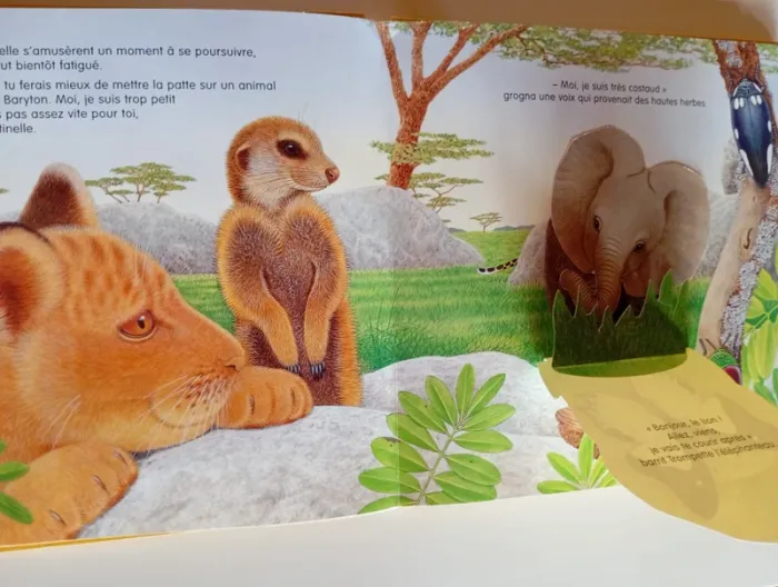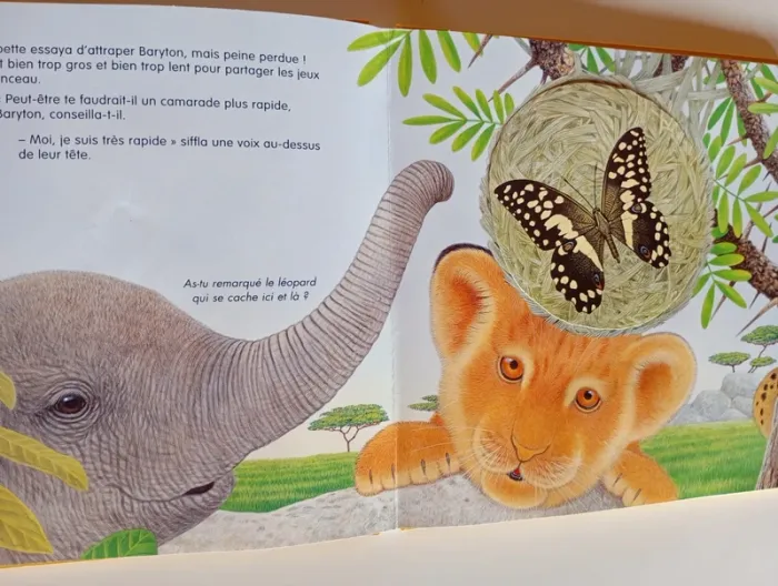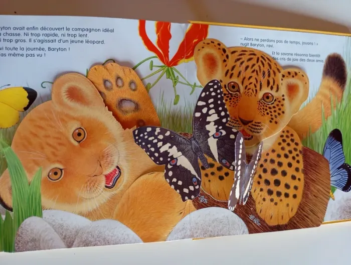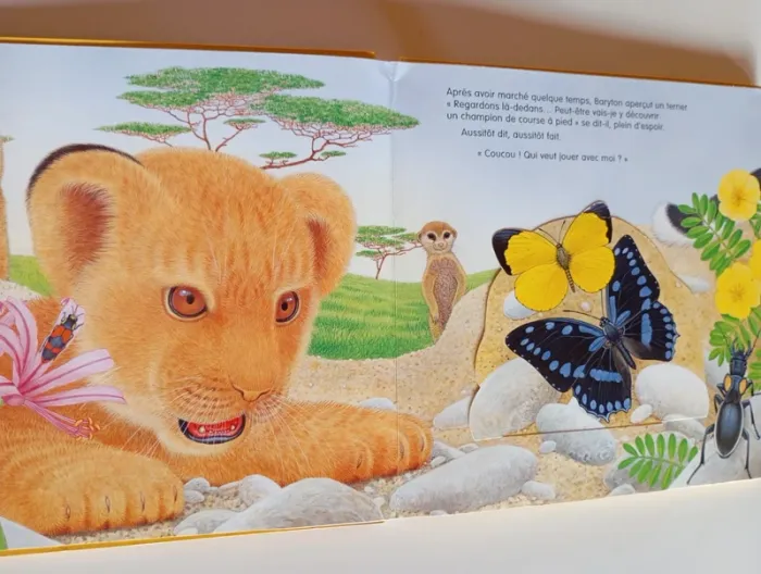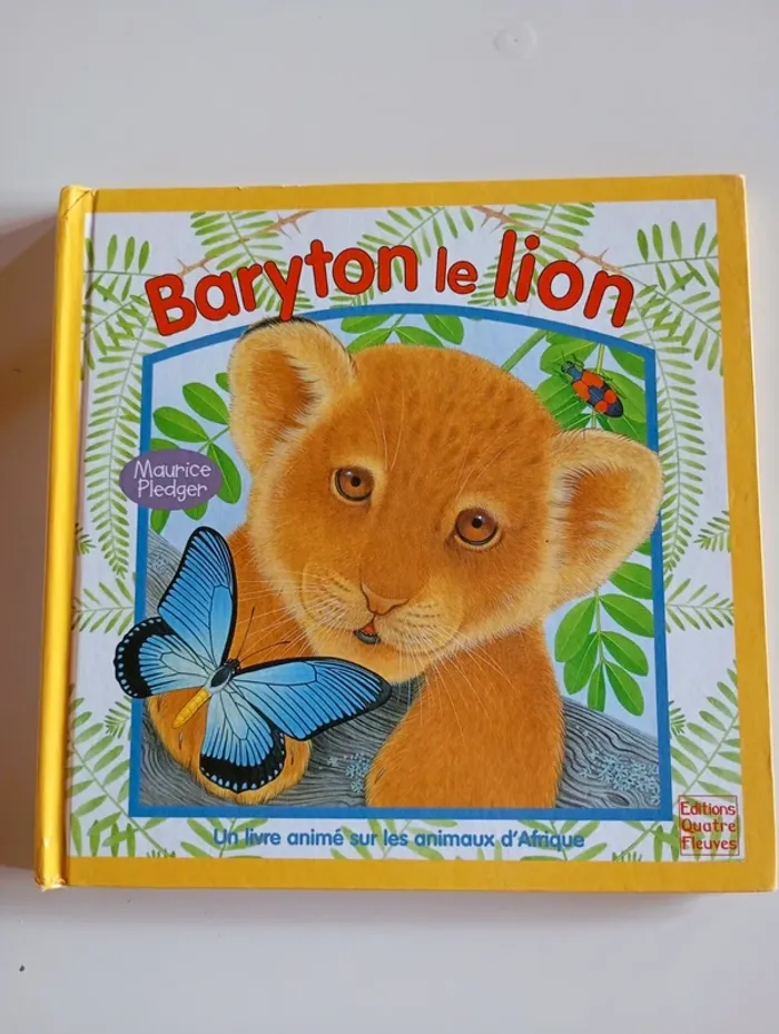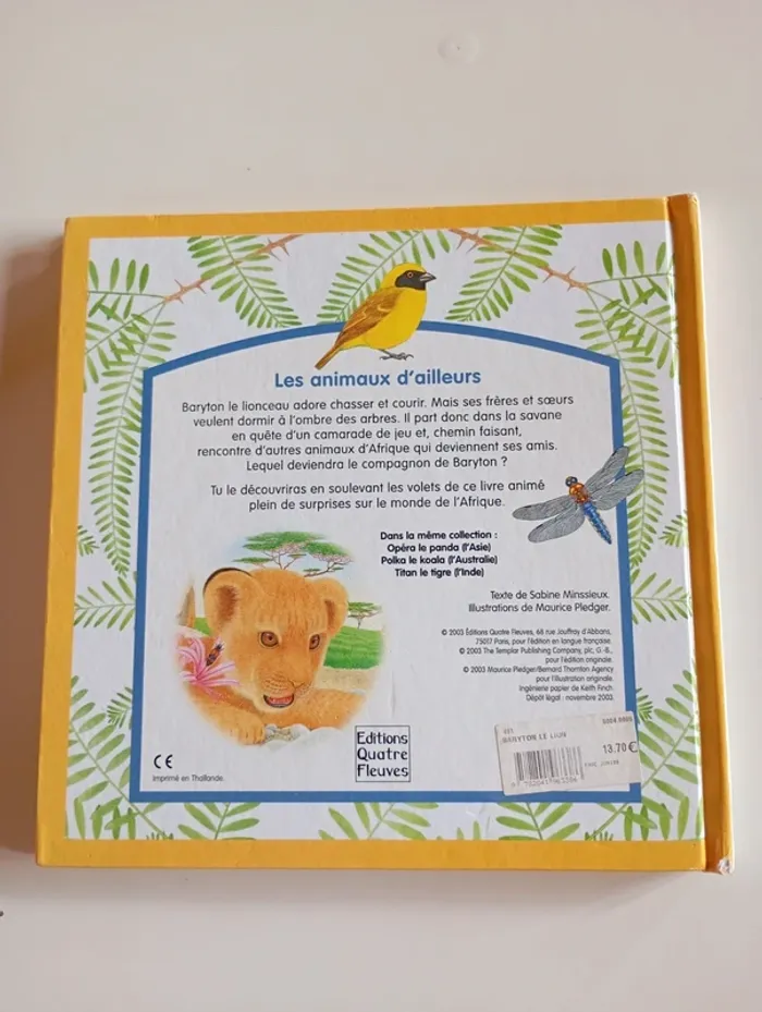 Baryton le lionceau adore chasser et courir. Mais ses frères et sœurs veulent dormir à l'ombre des arbres. Il part donc dans la savane en quête d'un camarade de jeu et, chemin faisant, rencontre d'autres animaux d'Afrique qui deviennent ses amis. Lequel deviendra le compagnon de Baryton ? Tu le découvriras en soulevant les volets de ce livre animé plein de surprises sur le monde de l'Afrique. Éditeur ‏ : ‎ Quatre Fleuves 18 pages Âge de lecture ‏ : ‎ 3 - 6 ans Dimensions ‏ : ‎ 25 x 1.6 x 25 cm Livre en très bon état (Petite marque au coin de la tranche) Je vends d'autres livres de la même collection #phil_peg_quatrefleuves #livrepopup #livreflap #lionceau #animaux