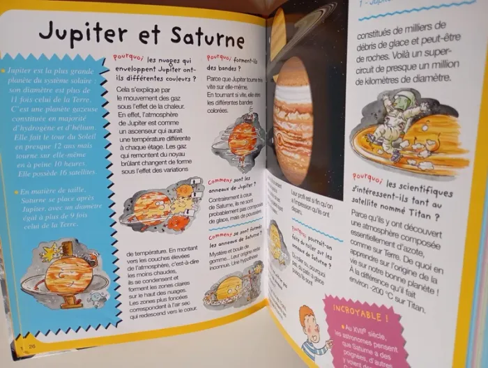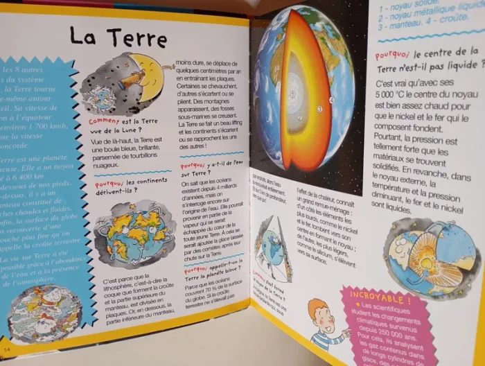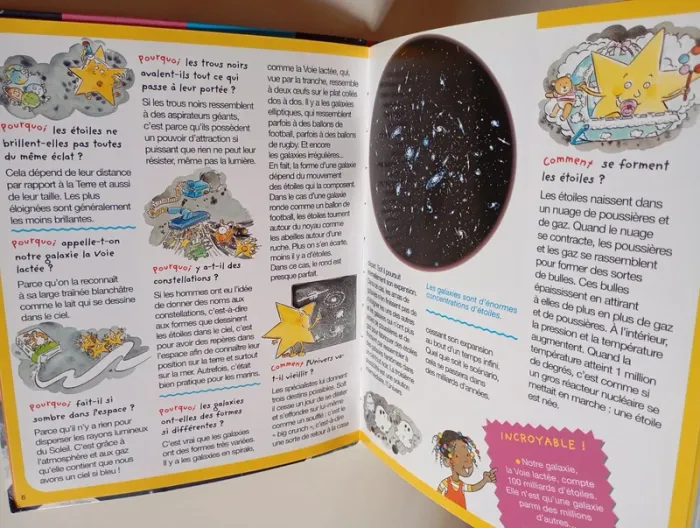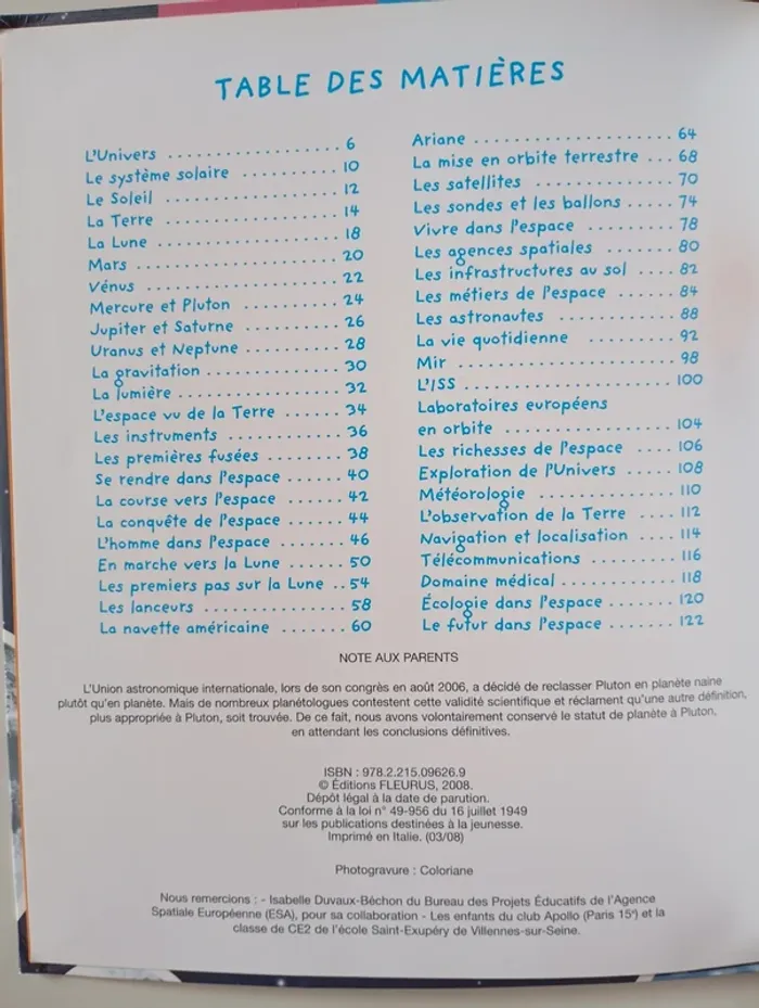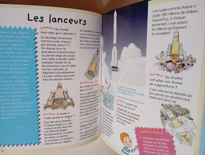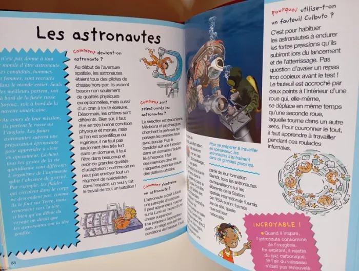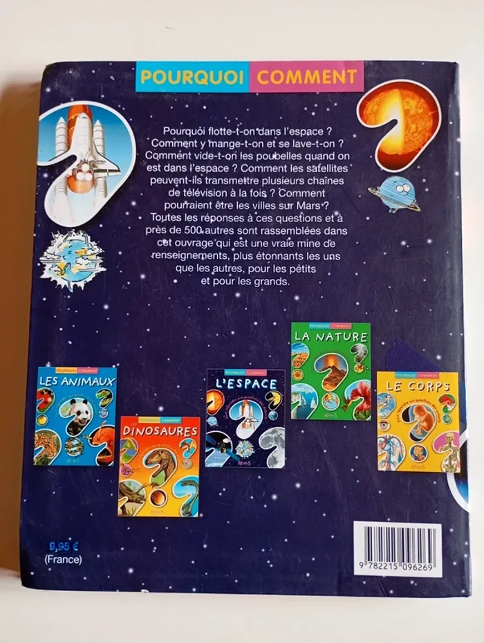 Pourquoi flotte-t-on dans l'espace ? Comment y mange-t-on et se lave-t-on ? Comment vide-t-on les poubelles quand on est dans l'espace ? Comment les satellites peuvent-ils transmettre plusieurs chaînes de télévision à la fois ? Comment pourraient être les villes sur Mars ? Toutes les réponses à ces question et à près de 500 autres sont rassemblées dans cet ouvrage qui est une vraie mine de renseignements, plus étonnants les uns que les autres, pour les petits et pour les grands. Éditeur ‏ : ‎ FLEURUS 128 pages Âge de lecture ‏ : ‎ 6 - 8 ans Dimensions ‏ : ‎ 18.5 x 1.3 x 22.7 cm Livre en très bon état Je vends d'autres livres sur l'espace #phil_peg_espace #espace #planète #terre #astronaute
