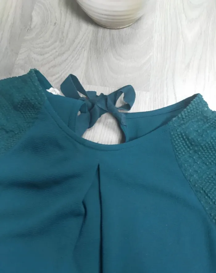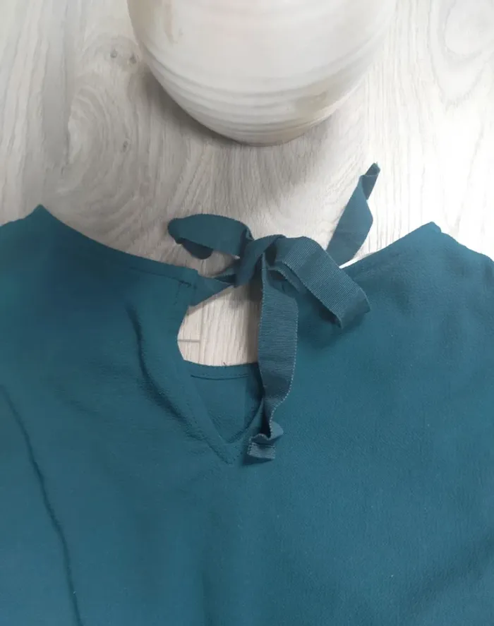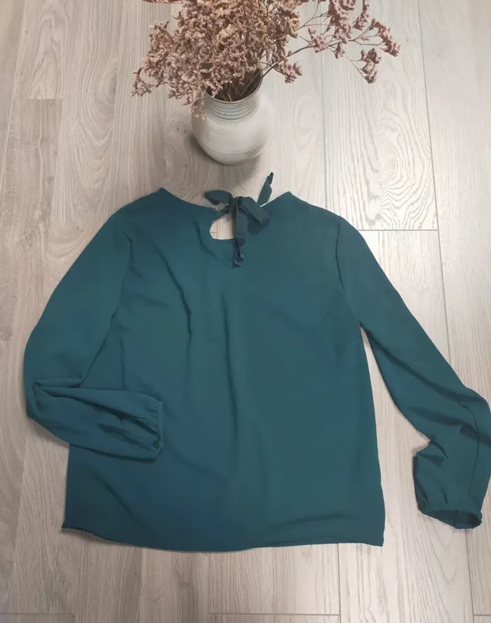 blouse manches longues couleur bleu canard resserrée aux manches par boutons et nœud dans le dos très bon état taille 38 M D'autres articles en M dans mon dressing trié et réduction activée sur les lots #niniz28hautm #niniz28blousem