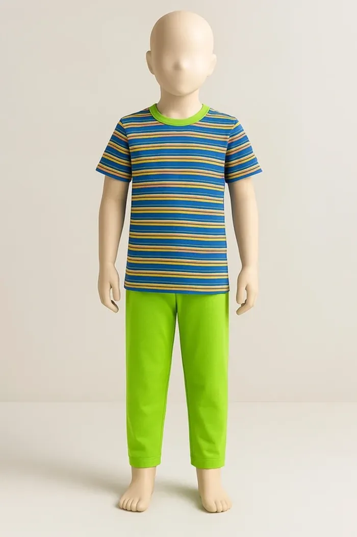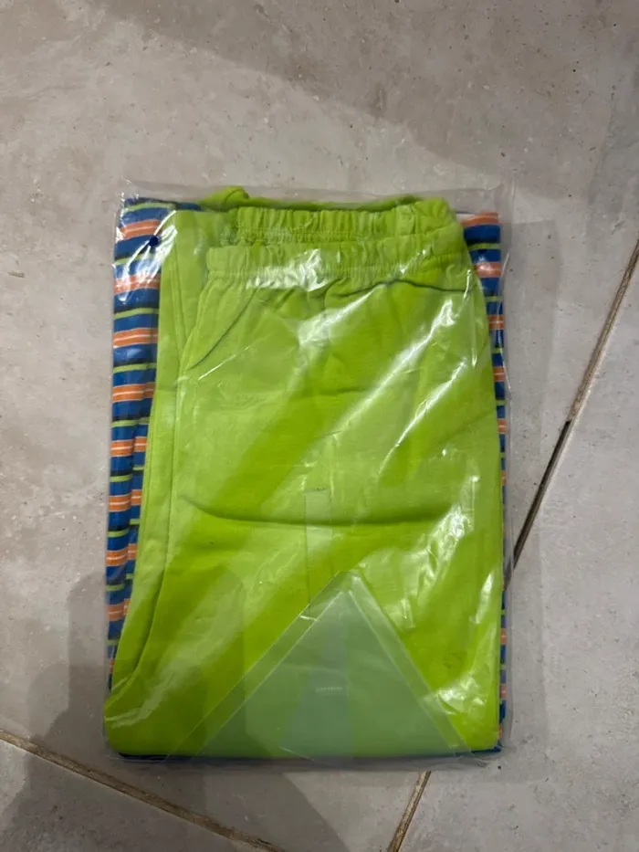 Ensemble deux pièces 100 % coton composé : • d’un tee-shirt à rayures colorées (bleu, orange, jaune, vert) avec col rond vert vif, • d’un pantalon long uni vert assorti à taille élastique. Matière douce et légère, parfait pour les nuits ou les soirées cocooning. Jamais porté, vendu neuf sous emballage.