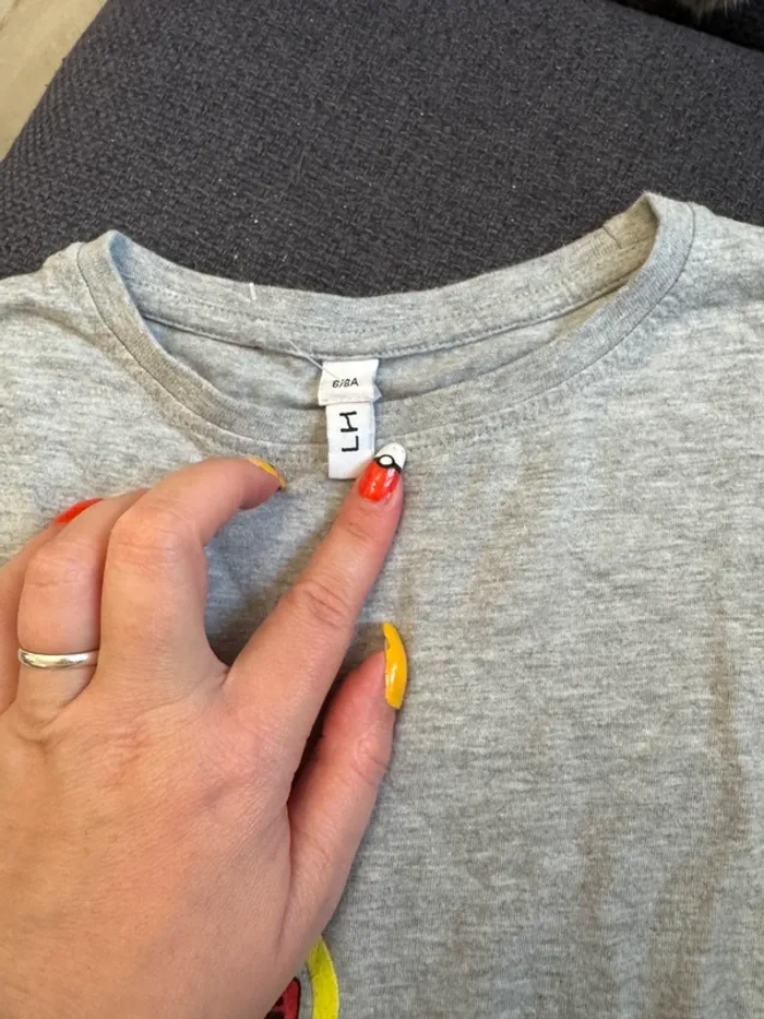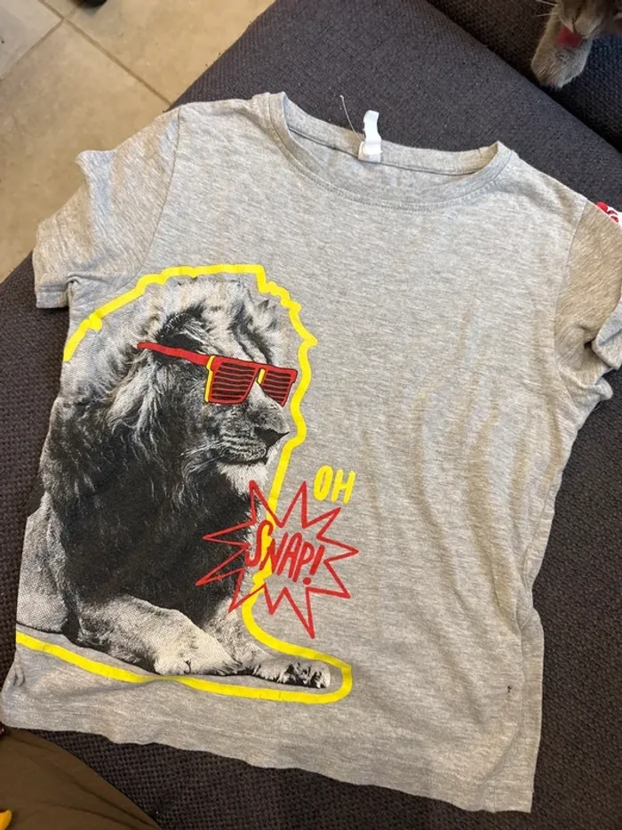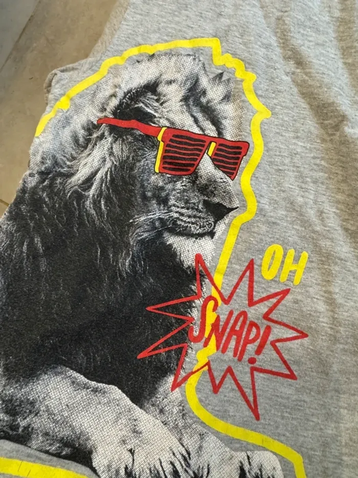 T-shirt gris clair avec imprimé original d’un lion portant des lunettes rouges et l’inscription “OH SNAP!”. Taille : 6 ans 👕 Coupe confortable, matière douce 🧼 Peu porté, en très bon état Parfait pour ajouter une touche cool et rigolote à une tenue d’enfant ! 💰 Prix : [à insérer selon ton choix] 📦 Envoi rapide et soigné