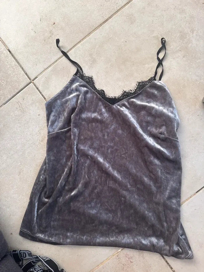 Superbe débardeur en velours gris, agrémenté de fines bretelles noires réglables et d’une délicate bordure en dentelle noire au décolleté. Matière douce et fluide, agréable à porter aussi bien pour une tenue élégante que pour un look décontracté. Taille M, en très bon état.