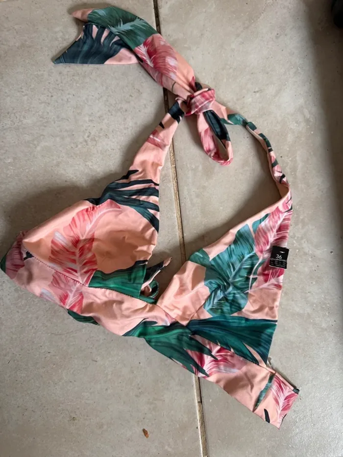 Description : Haut de maillot de bain Étam – taille 36, neuf avec étiquette. 🌸 Joli imprimé tropical avec feuillages verts et fleurs roses sur fond pêche. ✔️ Liens à nouer autour du cou et du dos pour un ajustement parfait. ✔️ Coupe triangle confortable et féminine. ✔️ Qualité Étam, idéal pour l’été et les vacances. 💡 État : Neuf, jamais porté.