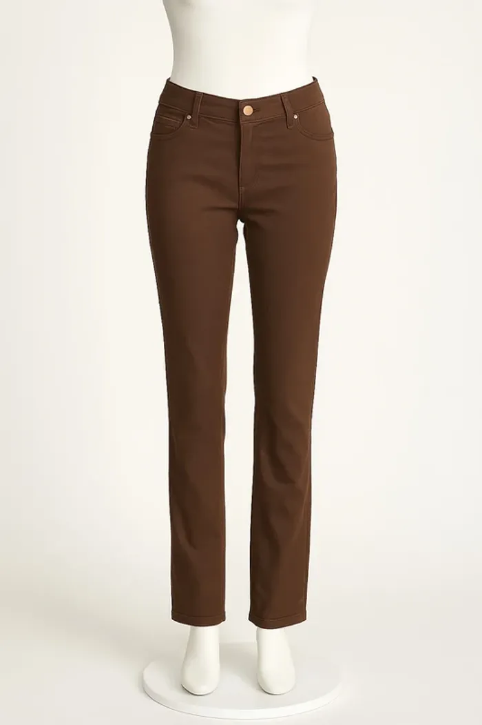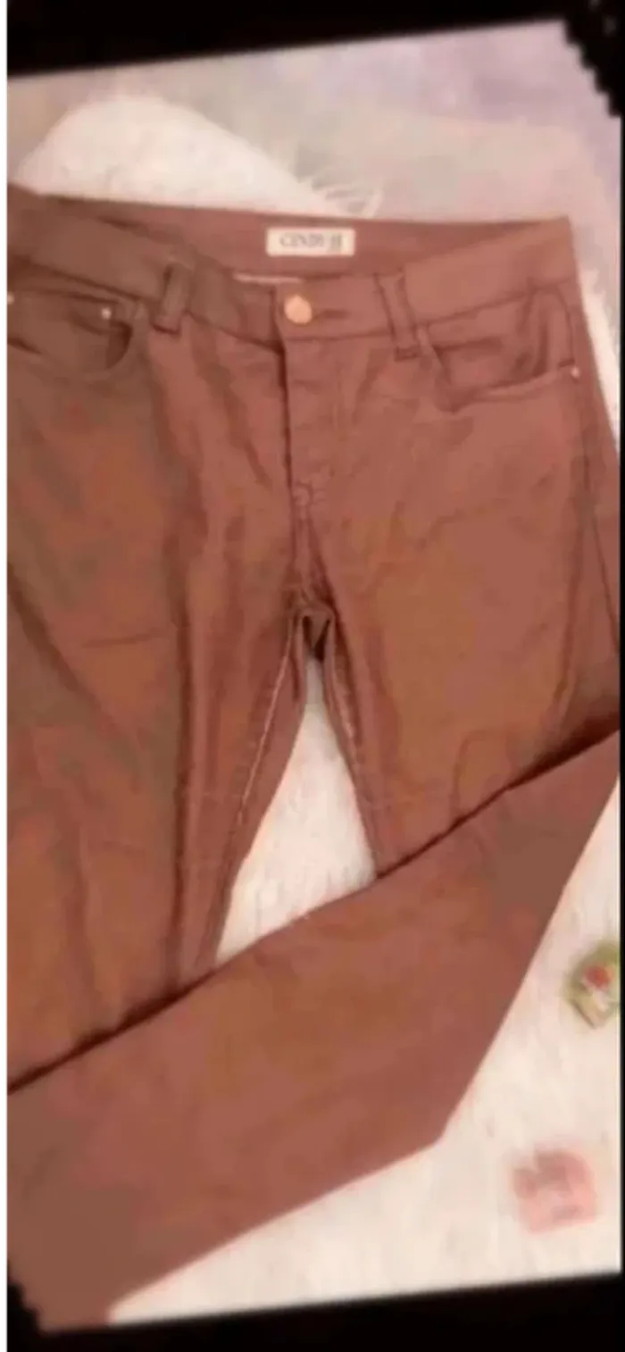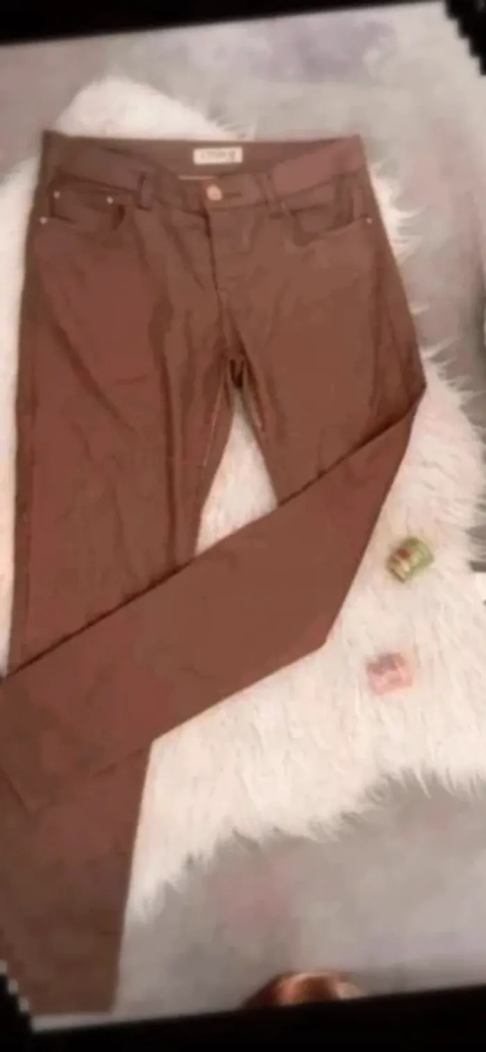 Pantalon coupe droite en toile stretch, couleur marron uni, idéal pour un look à la fois casual et élégant. Taille standard avec passants pour ceinture, fermeture zippée et bouton. Deux poches avant et deux poches arrière plaquées. 📏 Taille : (à préciser selon l’étiquette) ✨ État : Très bon état, peu porté. Parfait pour le quotidien ou le travail, facile à associer avec un chemisier, un pull ou un top plus décontracté.
