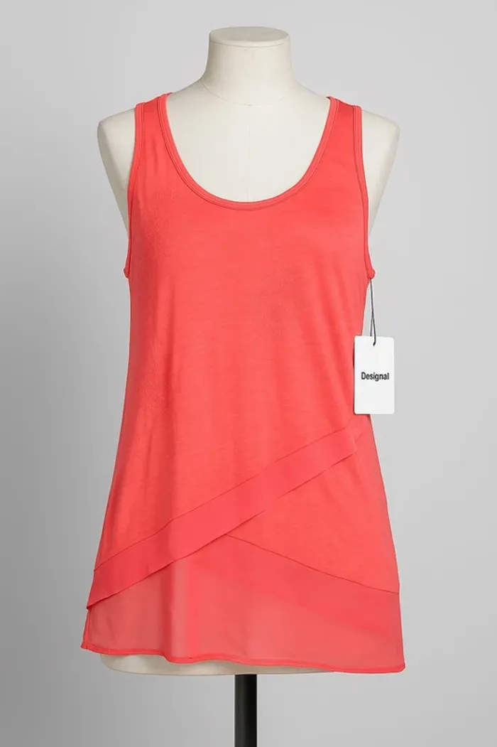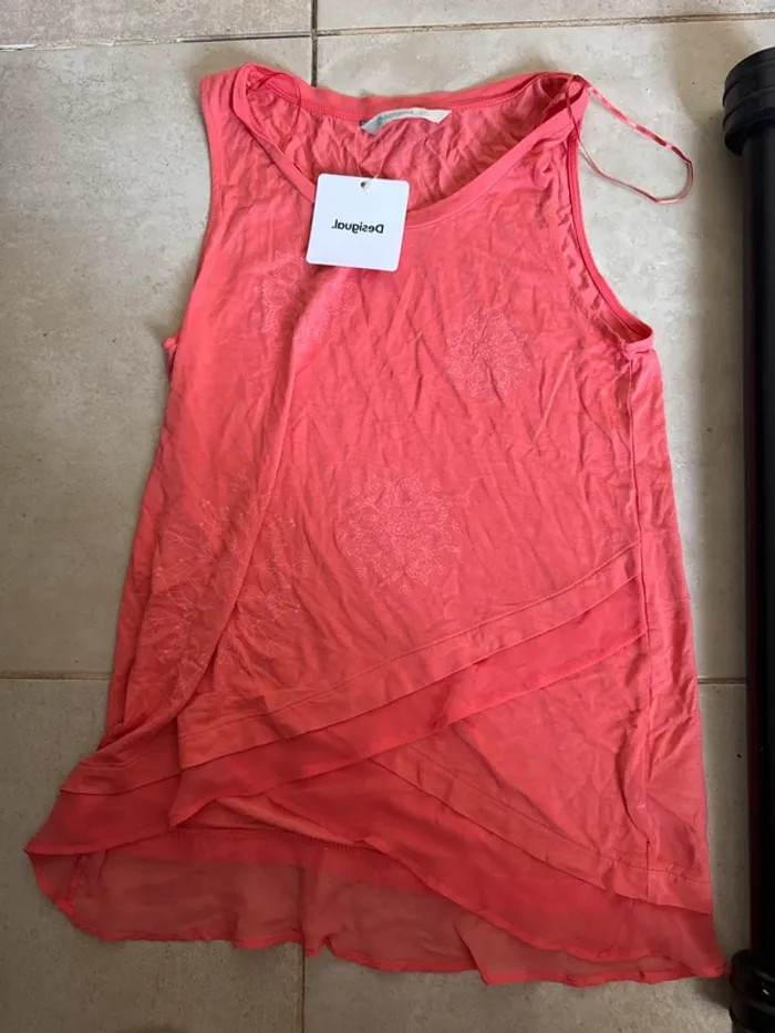 Joli débardeur/t-shirt sans manches Desigual en taille M, couleur corail avec de délicates broderies florales ton sur ton à l’avant. Coupe fluide et légère, avec effet superposé en voile en bas pour une touche élégante et féminine. 🔹 Marque : Desigual 🔹 Taille : M 🔹 État : Neuf avec étiquette 🔹 Idéal pour l’été ou à porter sous une veste Un haut confortable et original signé Desigual, parfait pour apporter de la couleur et du style à vos tenues. 🌸