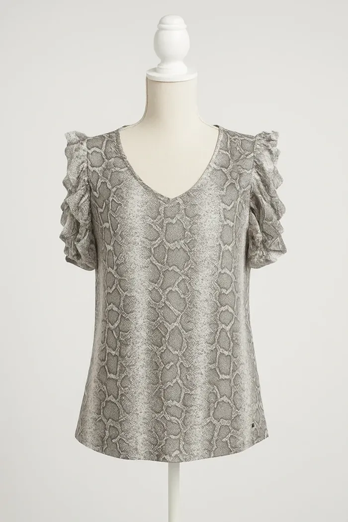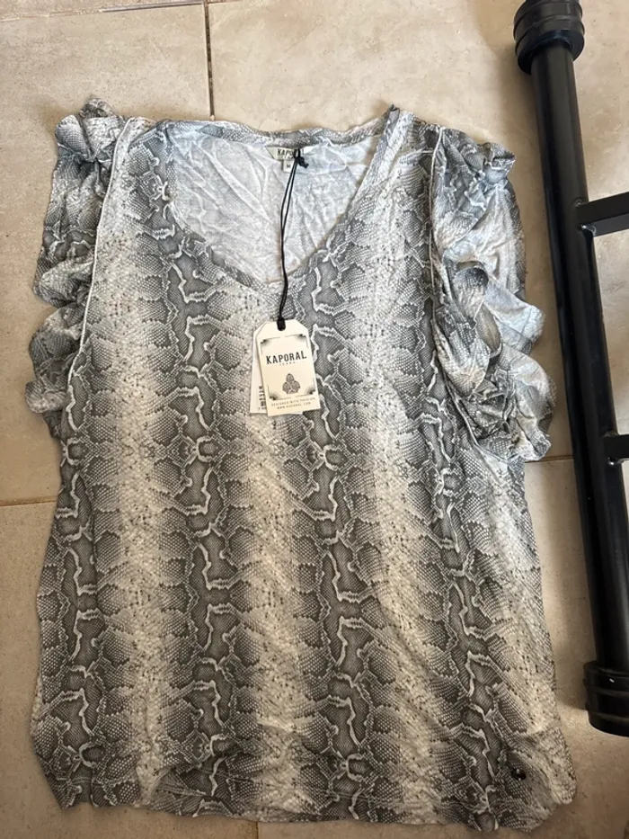 📏 Taille M – coupe confortable 🎨 Motif python noir et gris, tendance et moderne 👕 Manches à volants pour une touche féminine 🆕 Neuf avec étiquette Idéal pour un look chic et audacieux, facile à associer avec un jean ou une jupe. 💰 Prix doux, fais-toi plaisir !