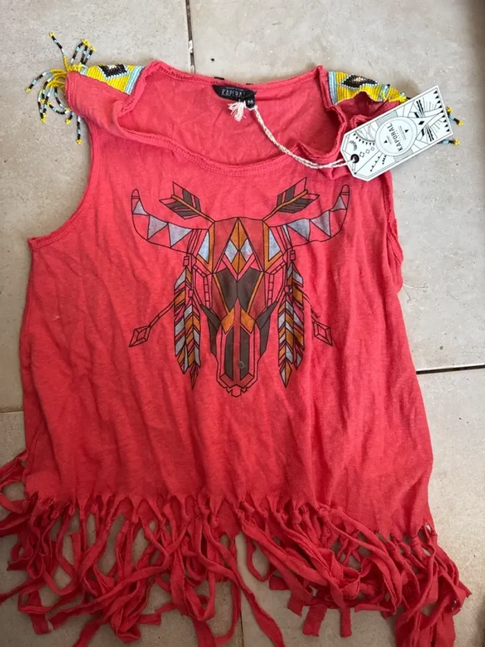 • Haut original signé Kaporal, neuf avec étiquette ✨ • Coloris rouge vif avec motif graphique tête de buffle style ethnique sur l’avant • Épaules décorées de perles colorées brodées pour un détail unique • Bas à franges découpées pour un look tendance et bohème • Coupe sans manches, légère et confortable 🌞 👉 Idéal pour l’été, à porter avec un short en jean ou une jupe pour un style casual et original. État : Neuf avec étiquette ✅