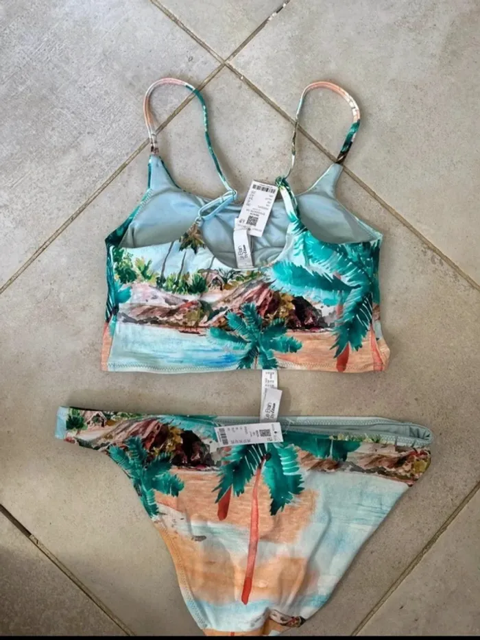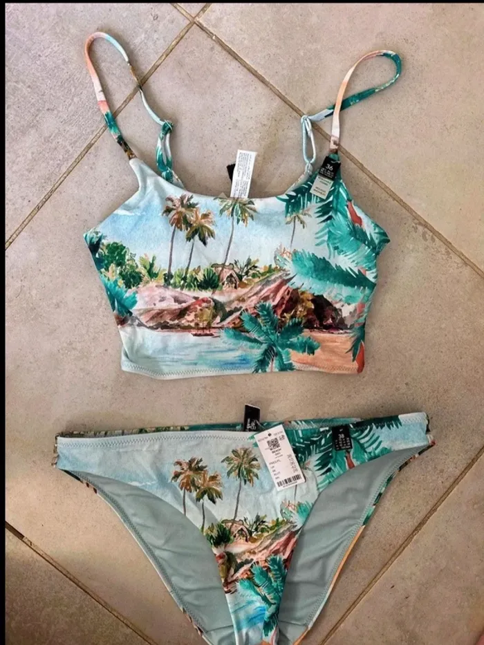 ✨ Ensemble bikini Etam au motif tropical paradisiaque : palmiers, plage, ciel bleu et eau turquoise – une vraie carte postale sur maillot ! Le haut style brassière à fines bretelles réglables offre un bon maintien tout en confort, idéal pour bronzer ou bouger. Le bas assorti, coupe classique légèrement échancrée, sublime la silhouette avec un imprimé parfaitement centré à l’avant. 🆕 Neuf, jamais porté, avec étiquettes d’origine 👙 Détails du produit : • Taille S (36 / 8) • Marque : Etam • État : Neuf avec étiquette • Haut type brassière, bretelles réglables • Bas coupe classique, entièrement doublé • Matière extensible, douce, sèche rapidement • Motif tropical original et lumineux 📦 Envoi rapide et soigné 💬 N’hésite pas à me contacter pour une remise si achat groupé ou lot de maillots !