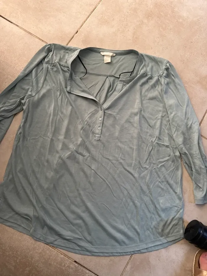 Blouse fluide à manches longues, en coloris bleu pastel. Col tunisien boutonné avec petit plissé aux épaules pour une touche féminine. Tissu léger et agréable à porter, parfait pour la mi-saison ou superposé. 📏 Taille : M 🧺 En bon état, très peu portée 📦 Envoi rapide et soigné