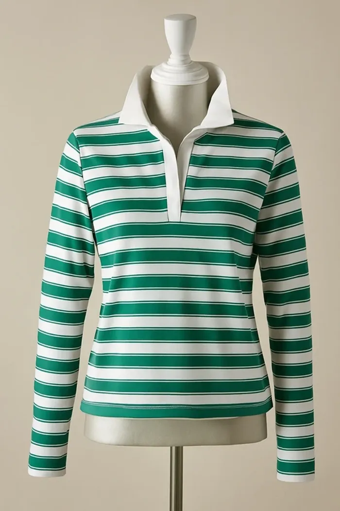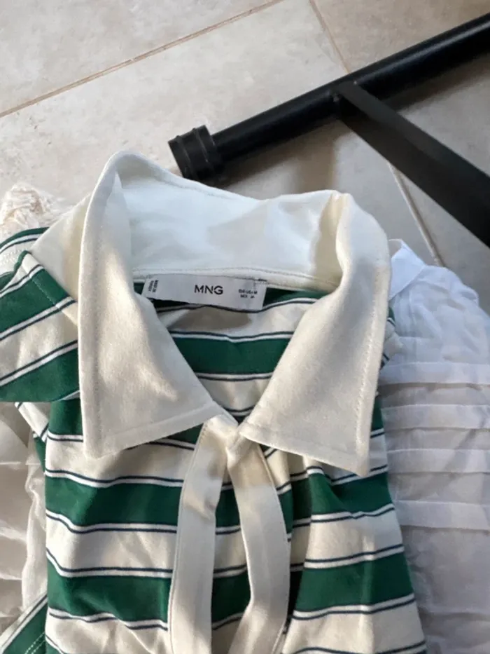 Très joli haut à rayures vertes et blanches, coupe droite avec col chemise structuré, original et élégant. Matière douce et agréable à porter. Fermeture partielle à l’avant pour un style casual chic. Parfait pour le printemps ou les journées fraîches d’été. 💡 Car son col travaillé fait toute la différence, il se porte aussi bien en mode décontracté qu’un peu habillé. En très bon état.