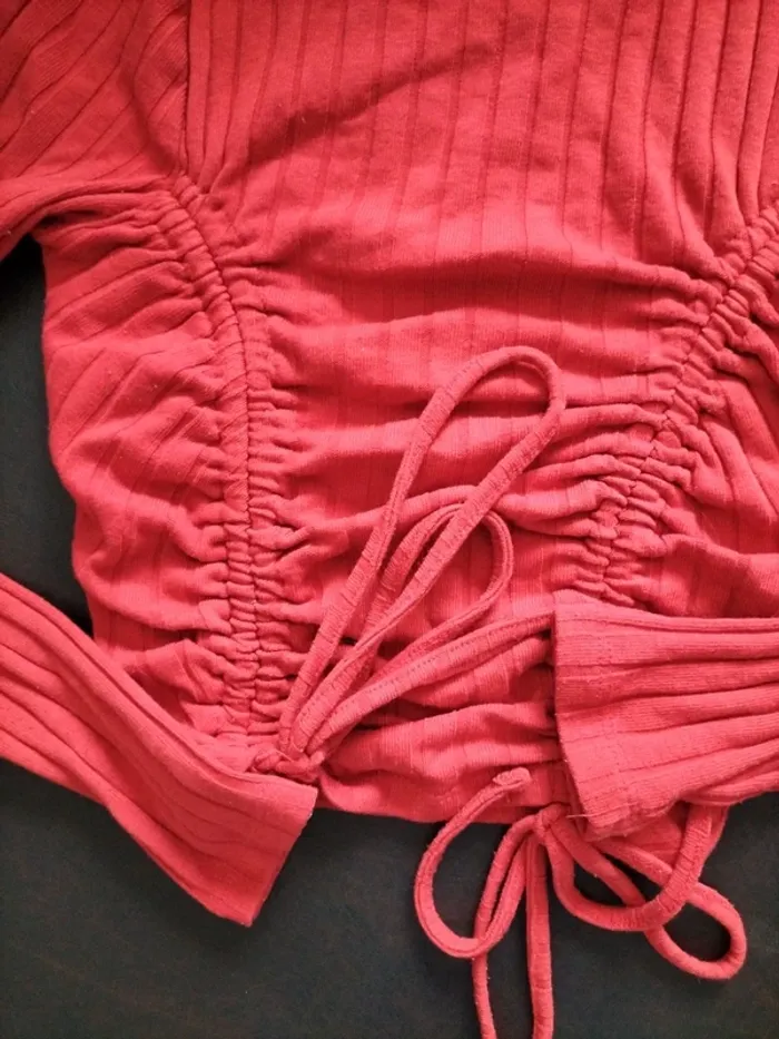 1 tee shirt rouge manches longues en jersey de coton et elasthanne avec laçage sur le devant