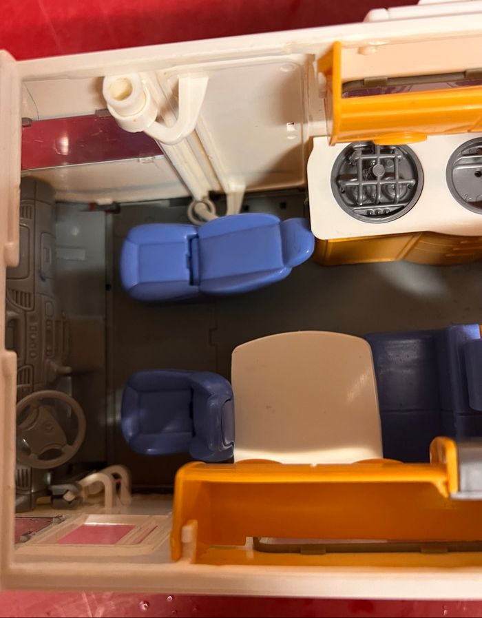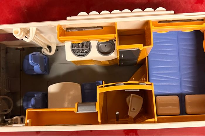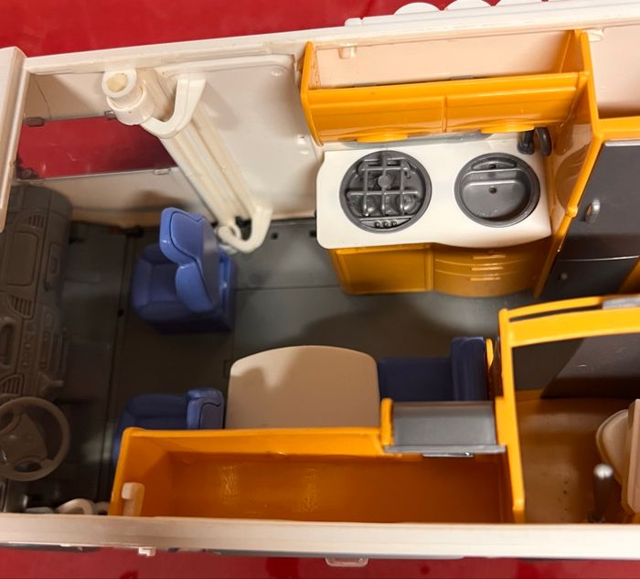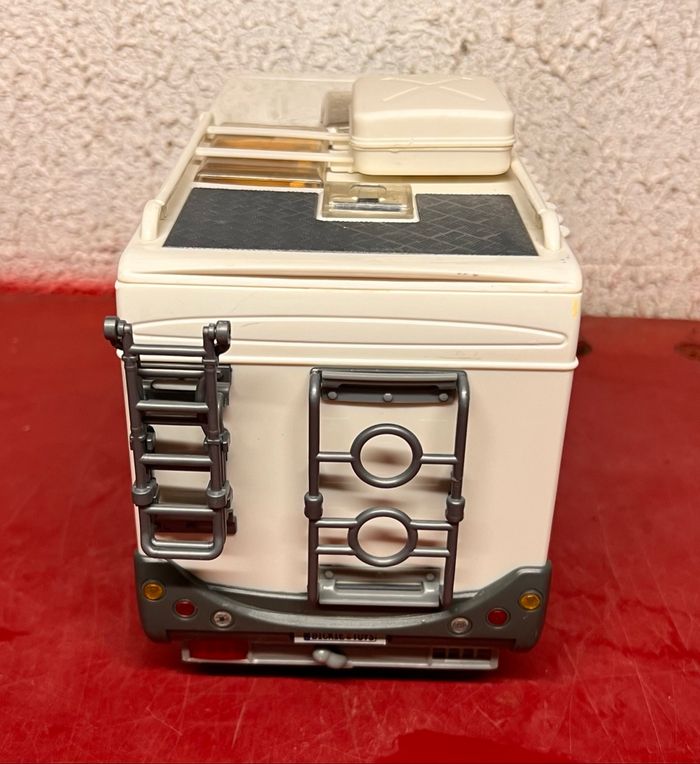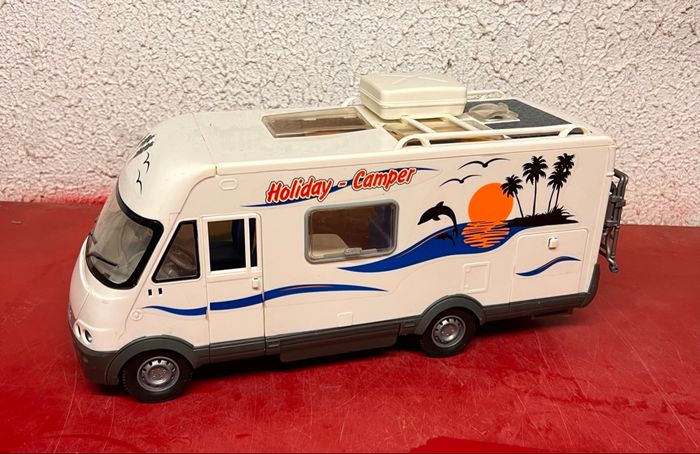 Camping-car Dickie Toys • Toit amovible fenêtres et portes à ouvrir • Intérieur riche en détail Siège passager s’allonge Manque 1 rétroviseur • Longueur : 30 cm