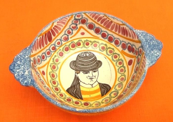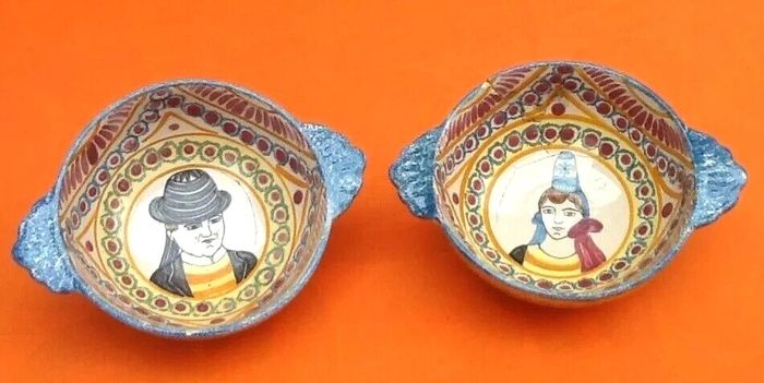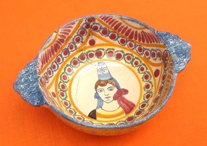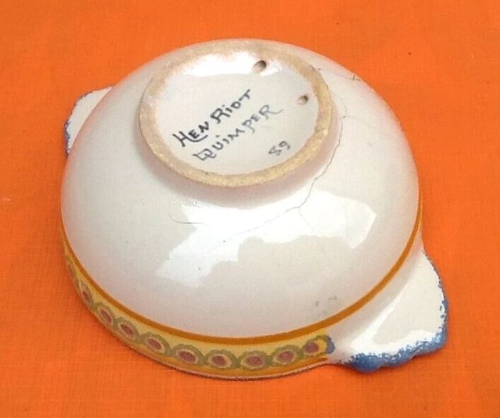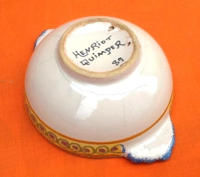 (article vendu en l' état, pour décoration, nous précisons recollages, fêles, ébréchures, ... état d' usage voir toutes les photos) 2 anciens bols à oreilles Faïence Henriot Quimper N°89 Diamètre (sans les oreilles) : 125mm Hauteur : 60mm Poids total : 485grs